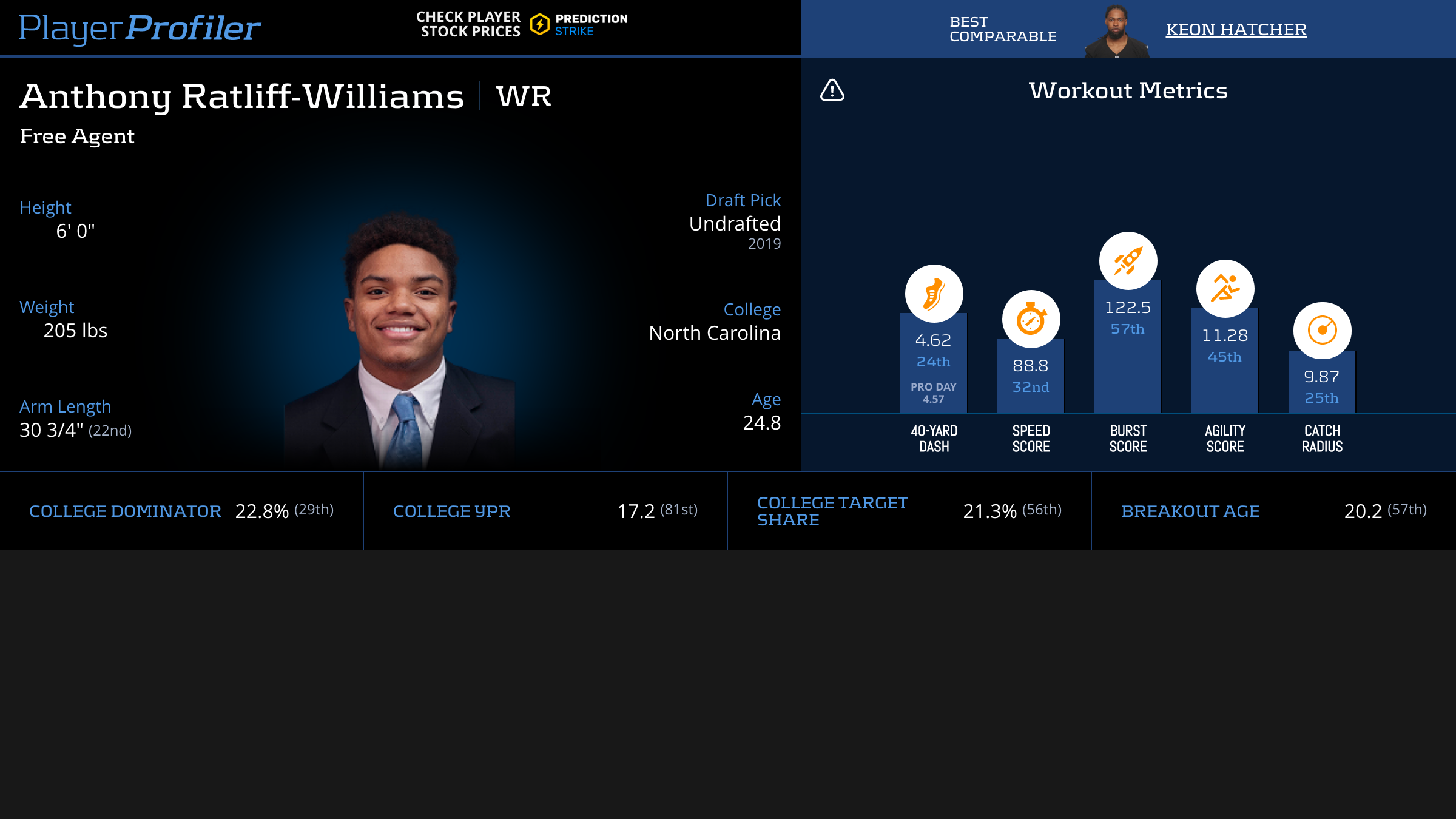 | Year Year | Games Games | Receptions Recs | Receiving Yards Rec Yds | Target Share Tgt Share | Catch Rate Catch Rate | Receiving Touchdowns Rec TDs | Special Teams Yards Special Teams | Age Age | School School |