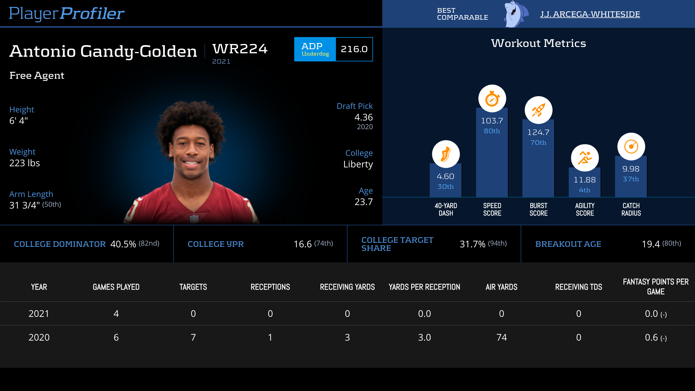 | Year Year | Games Games | Receptions Recs | Receiving Yards Rec Yds | Target Share Tgt Share | Catch Rate Catch Rate | Receiving Touchdowns Rec TDs | Special Teams Yards Special Teams | Age Age | School School |