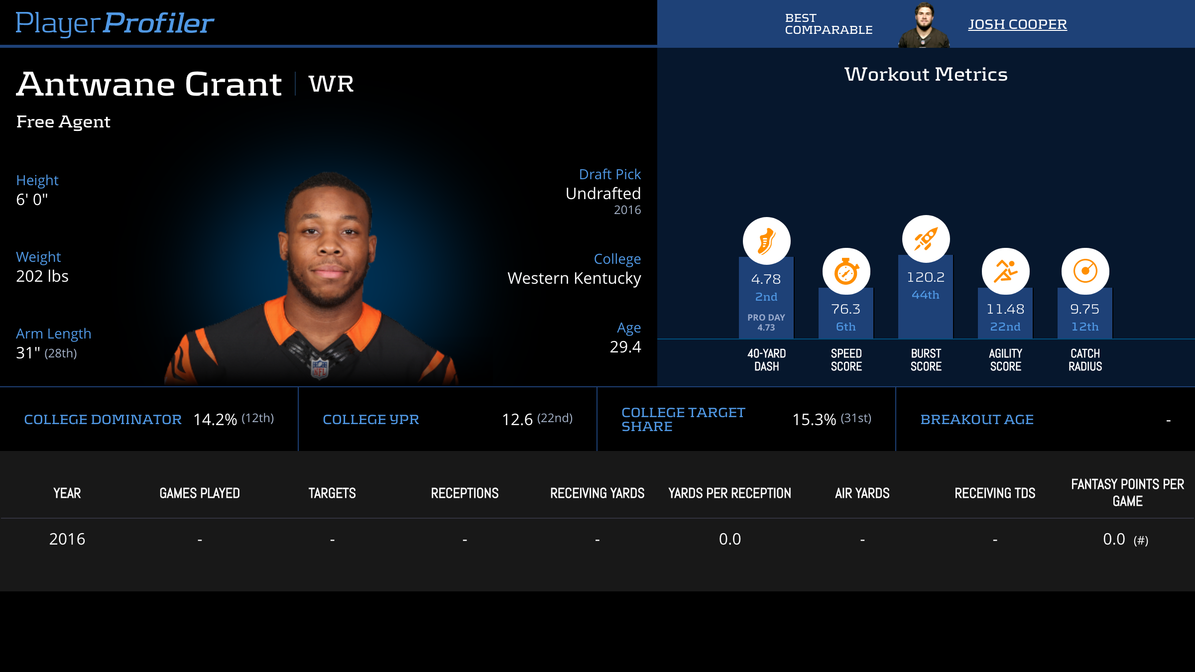 | Year Year | Games Games | Receptions Recs | Receiving Yards Rec Yds | Target Share Tgt Share | Catch Rate Catch Rate | Receiving Touchdowns Rec TDs | Special Teams Yards Special Teams | Age Age | School School |