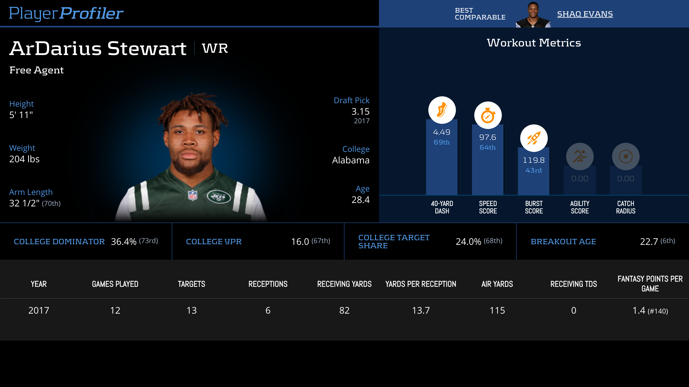 Box score statistics such as targets, yards, touchdowns, and fantasy points per target are updated the next day. Advanced stats and metrics are updated later in the week during the NFL season.