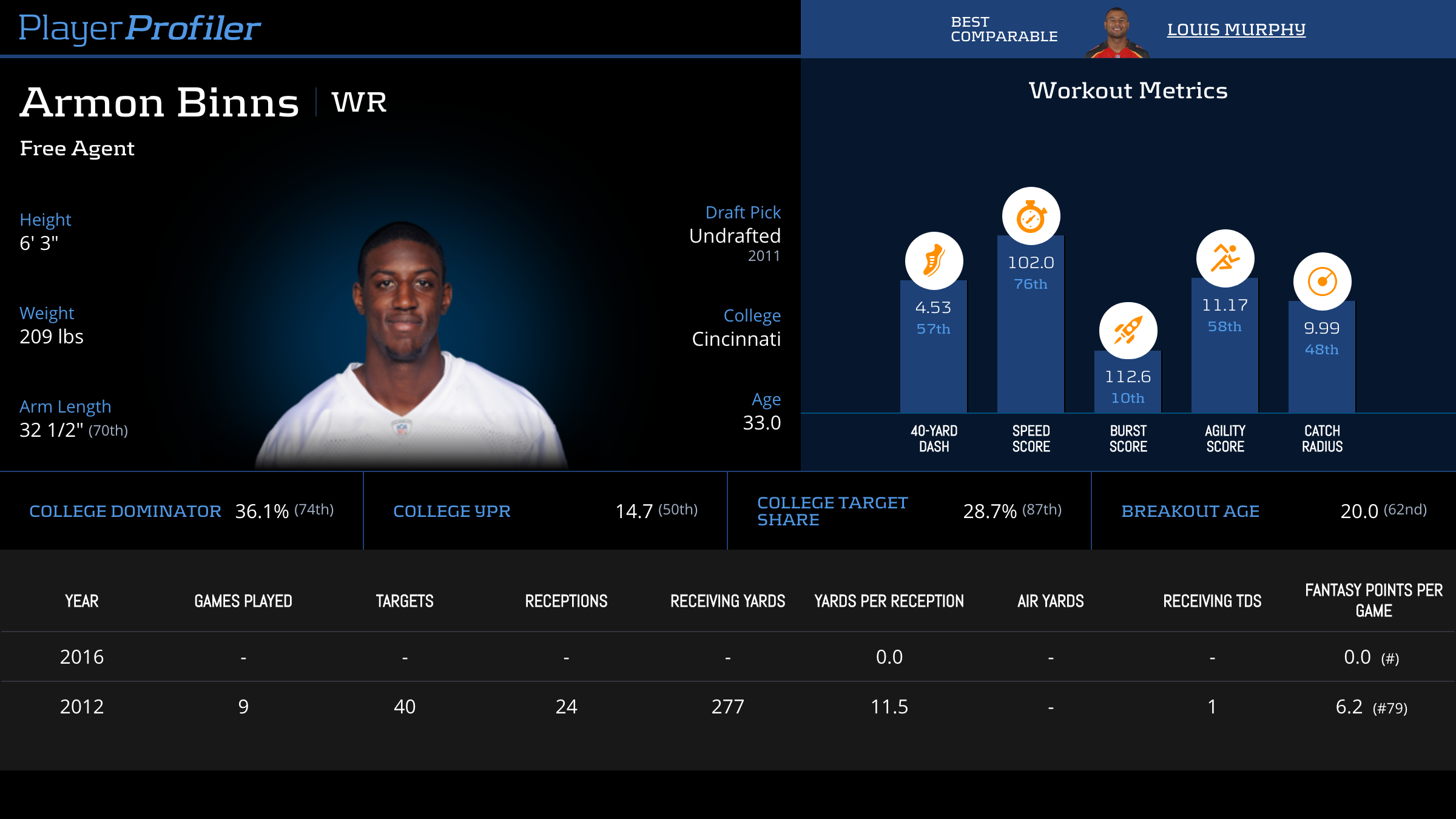 | Year Year | Games Games | Receptions Recs | Receiving Yards Rec Yds | Target Share Tgt Share | Catch Rate Catch Rate | Receiving Touchdowns Rec TDs | Special Teams Yards Special Teams | Age Age | School School |