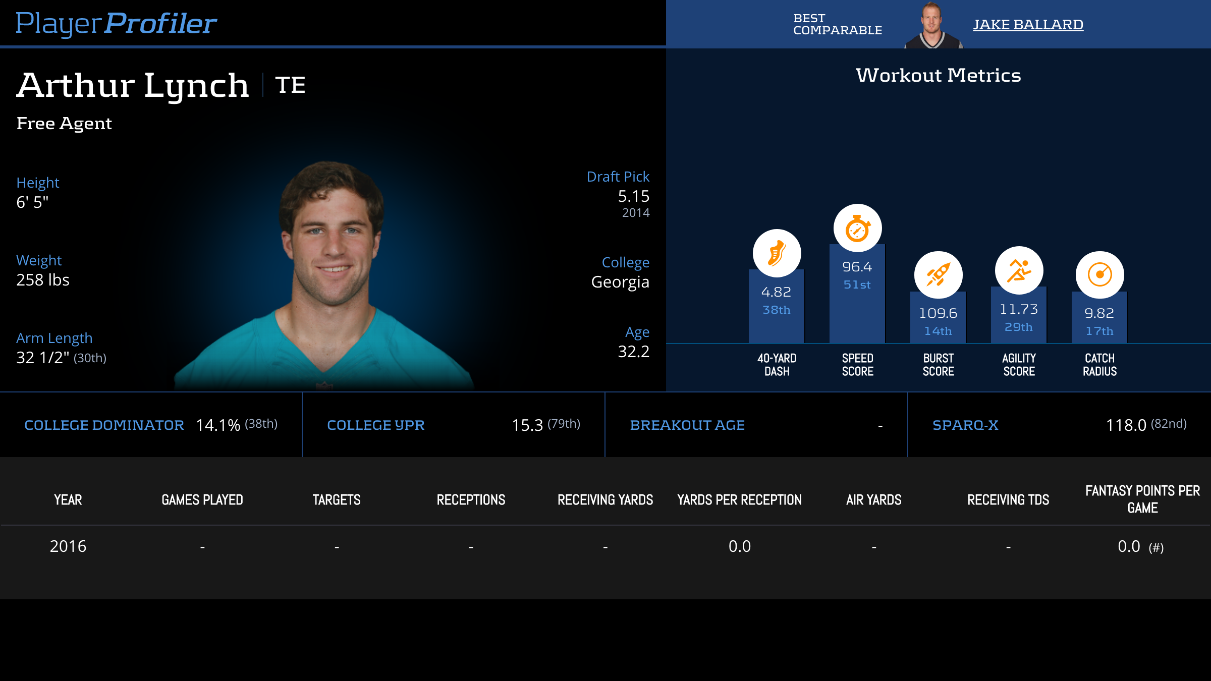 | Year Year | Games Games | Receptions Recs | Receiving Yards Rec Yds | Target Share Tgt Share | Catch Rate Catch Rate | Receiving Touchdowns Rec TDs | Special Teams Yards Special Teams | Age Age | School School |