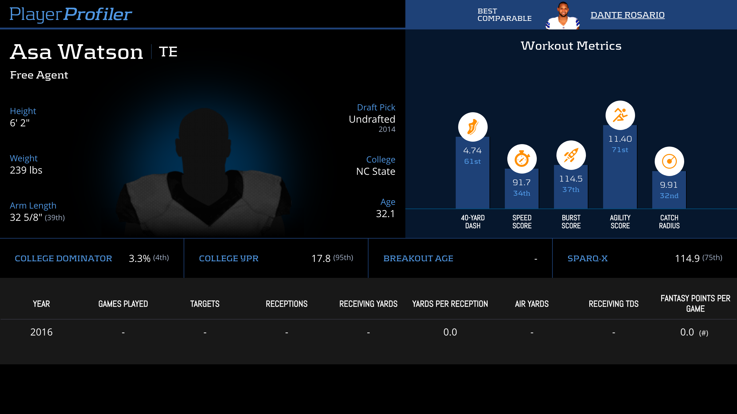 | Year Year | Games Games | Receptions Recs | Receiving Yards Rec Yds | Target Share Tgt Share | Catch Rate Catch Rate | Receiving Touchdowns Rec TDs | Special Teams Yards Special Teams | Age Age | School School |