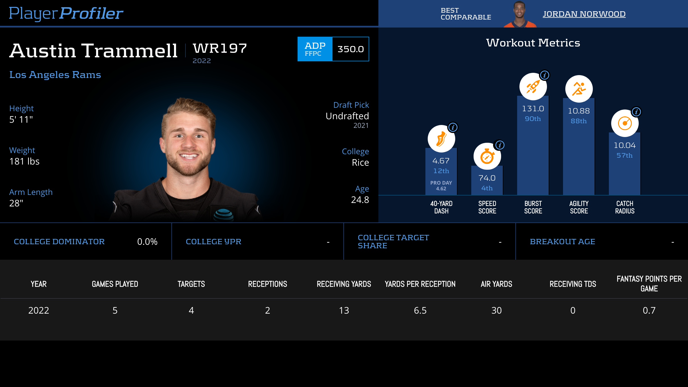 | 11 | LAC | Donte Jackson | 21.1% | 3 (13.6% rate) | 1 | 1 | 13 (13 air) | 2.3 (#82) |