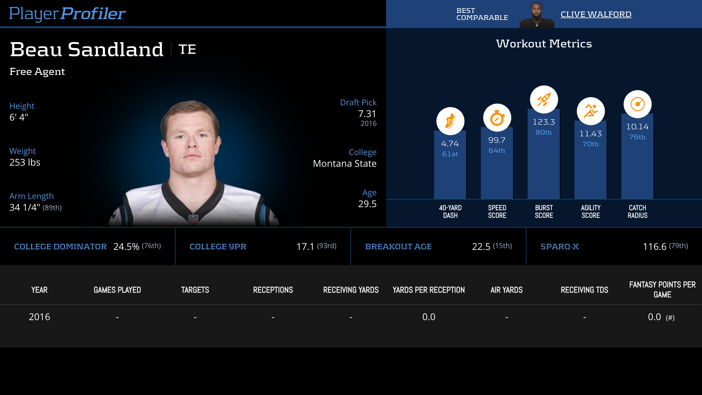 | Year Year | Games Games | Receptions Recs | Receiving Yards Rec Yds | Target Share Tgt Share | Catch Rate Catch Rate | Receiving Touchdowns Rec TDs | Special Teams Yards Special Teams | Age Age | School School |