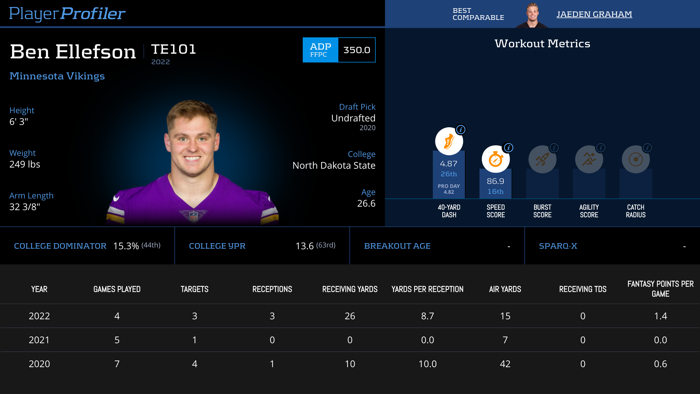 Box score statistics such as targets, yards, touchdowns, and fantasy points per target are updated the next day. Advanced stats and metrics are updated later in the week during the NFL season.