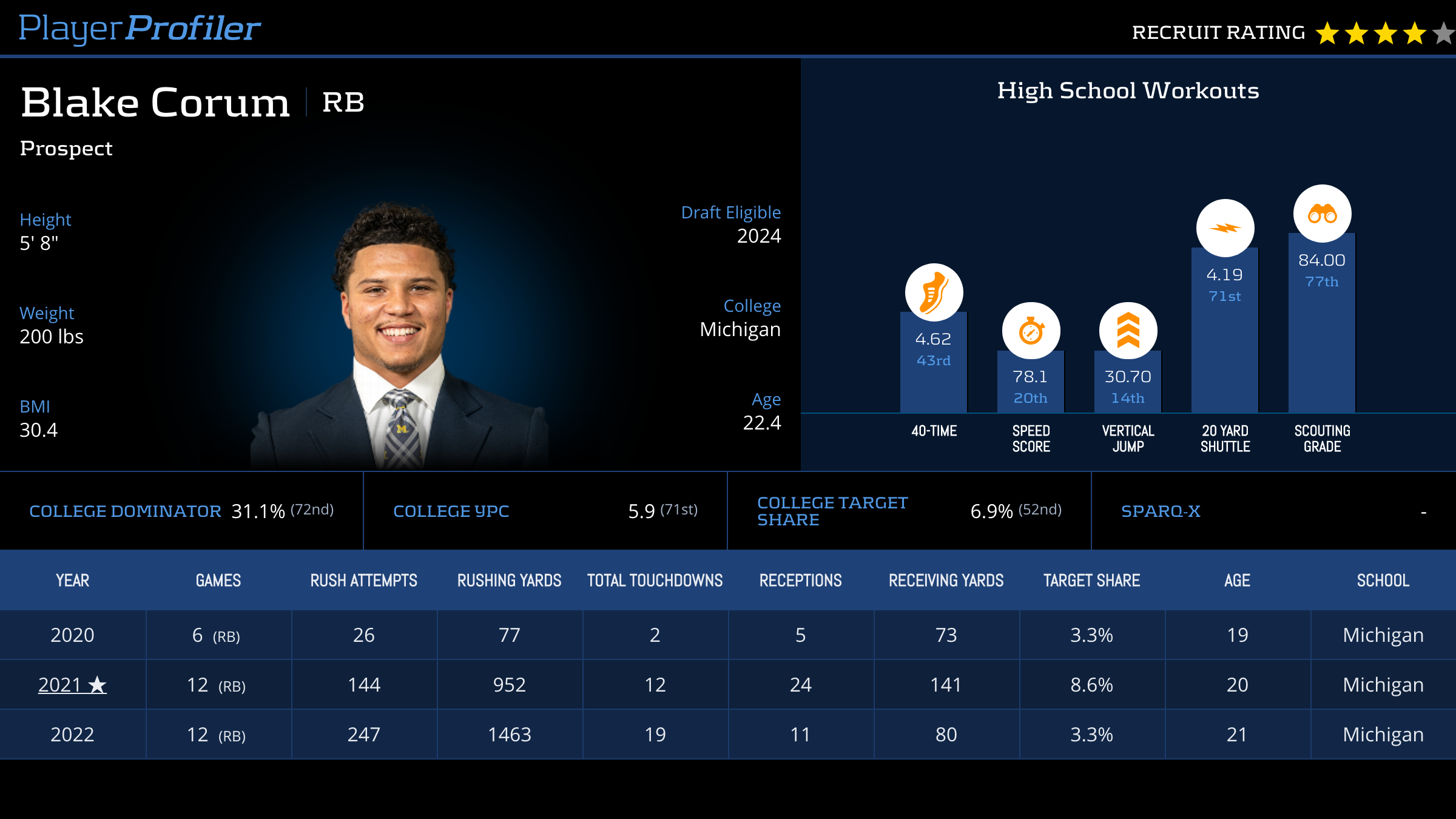 | Year Year | Games Games | Rush Attempts Rush Atts | Rushing Yards Rush Yrds | Total Touchdowns TDs | Receptions Rec | Receiving Yards Rec Yrds | Target Share Tgt Share | Age Age | School School |