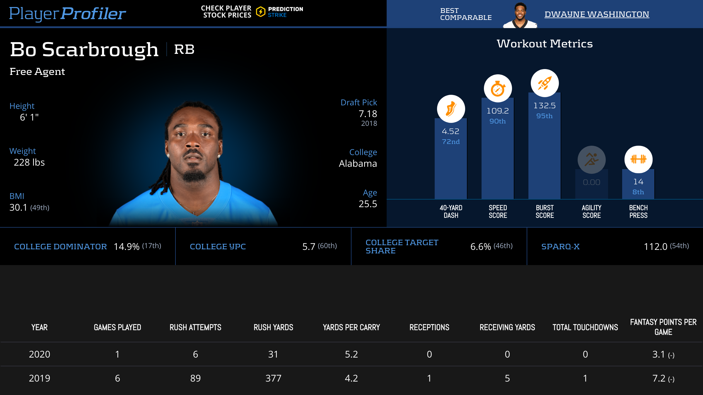 | Year Year | Games Games | Rush Attempts Rush Atts | Rushing Yards Rush Yrds | Total Touchdowns TDs | Receptions Rec | Receiving Yards Rec Yrds | Target Share Tgt Share | Age Age | School School |