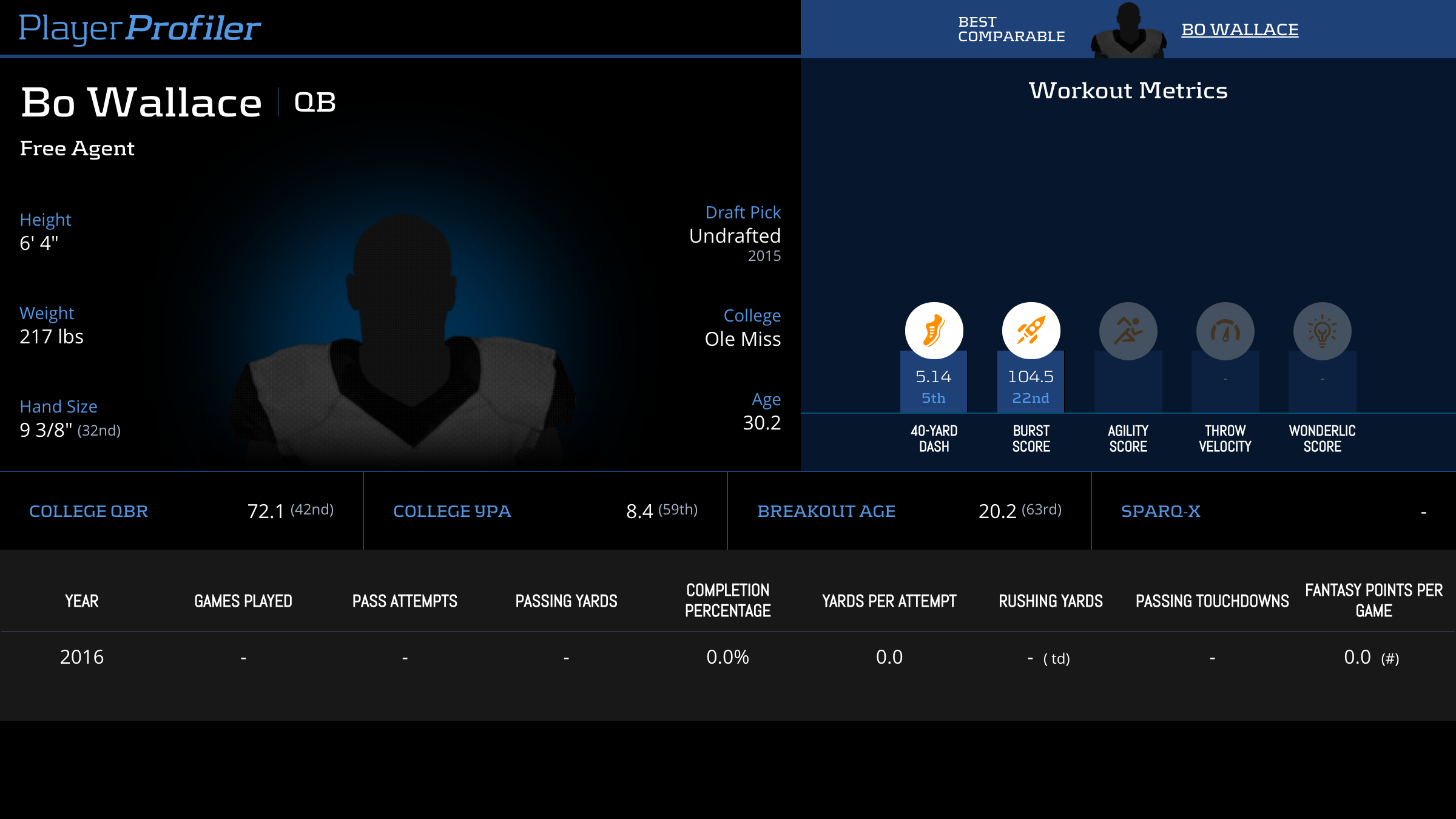 | Year Year | Games Games | Pass Attempts Pass Atts | Passing Yards Pass Yds | Yards Per Attempt YPA | Completion Percentage Comp % | Passing Touchdowns Pass TDs | Rushing Yards Rush Yds | Age Age | School School |