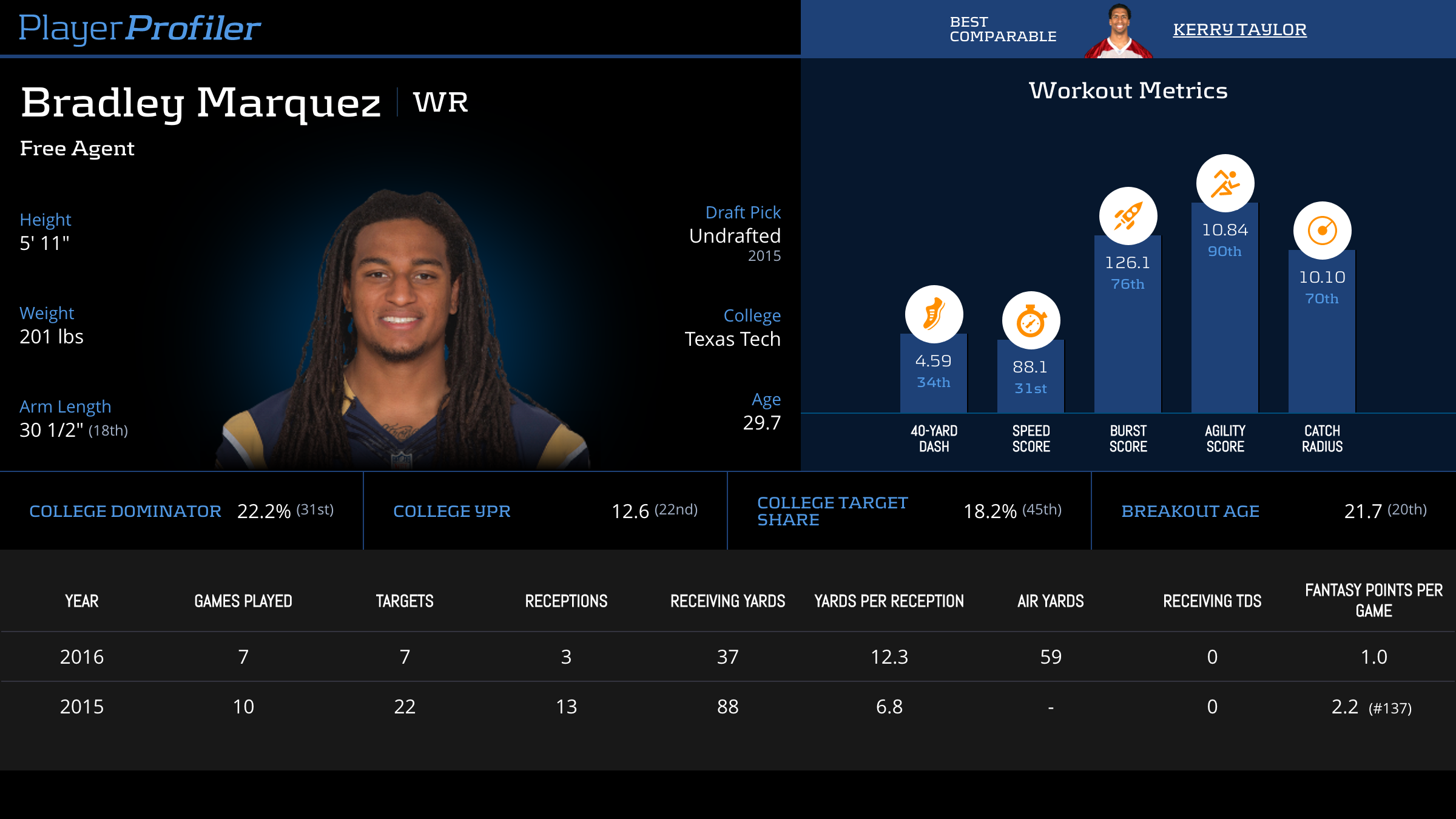 | Year Year | Games Games | Receptions Recs | Receiving Yards Rec Yds | Target Share Tgt Share | Catch Rate Catch Rate | Receiving Touchdowns Rec TDs | Special Teams Yards Special Teams | Age Age | School School |