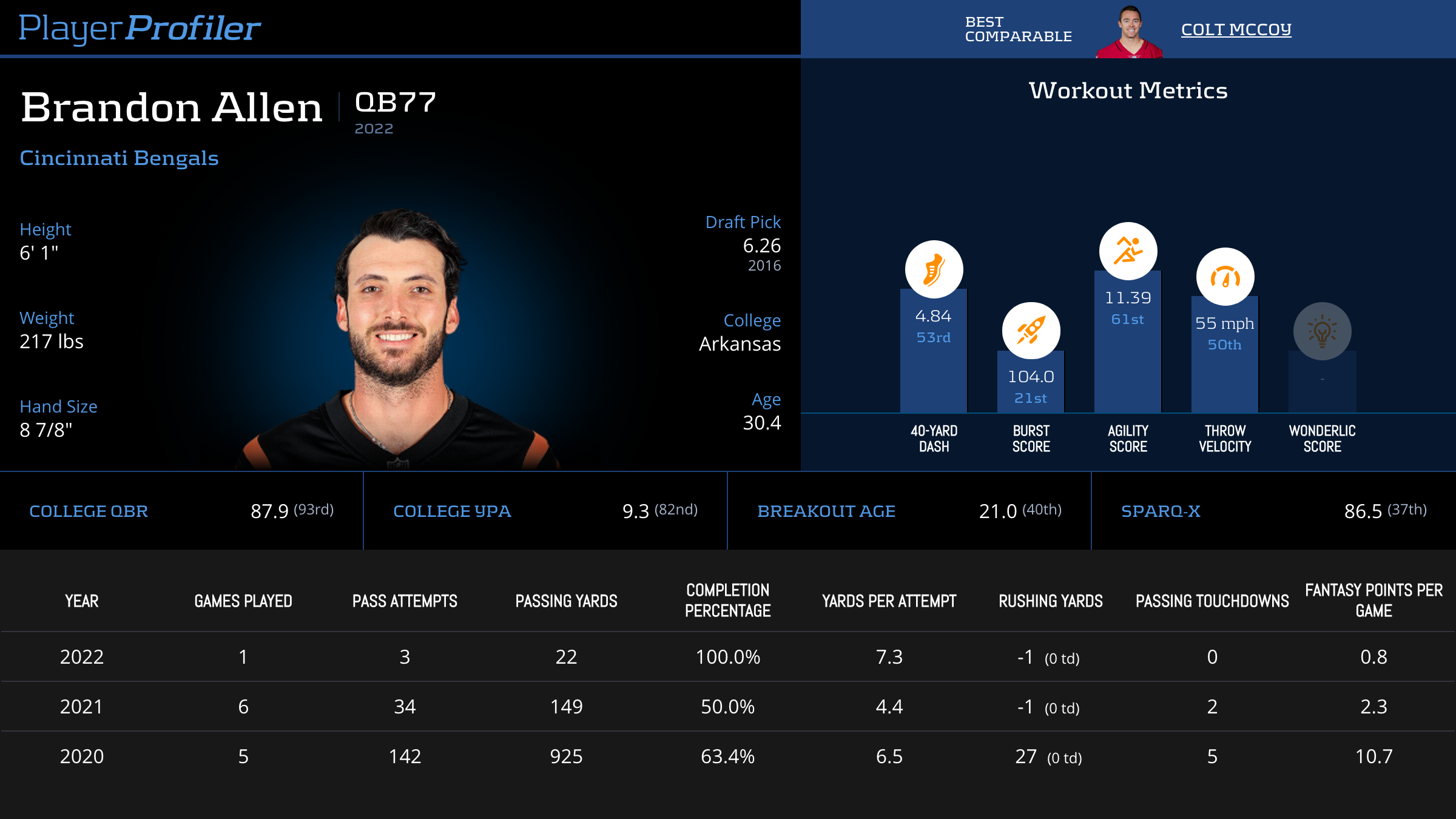 | 14 | CHI | 1 | 0.0% | 0 (27 air) | 0.0 | 0 (1 int) | -- | -- | -1.0 (#33) |