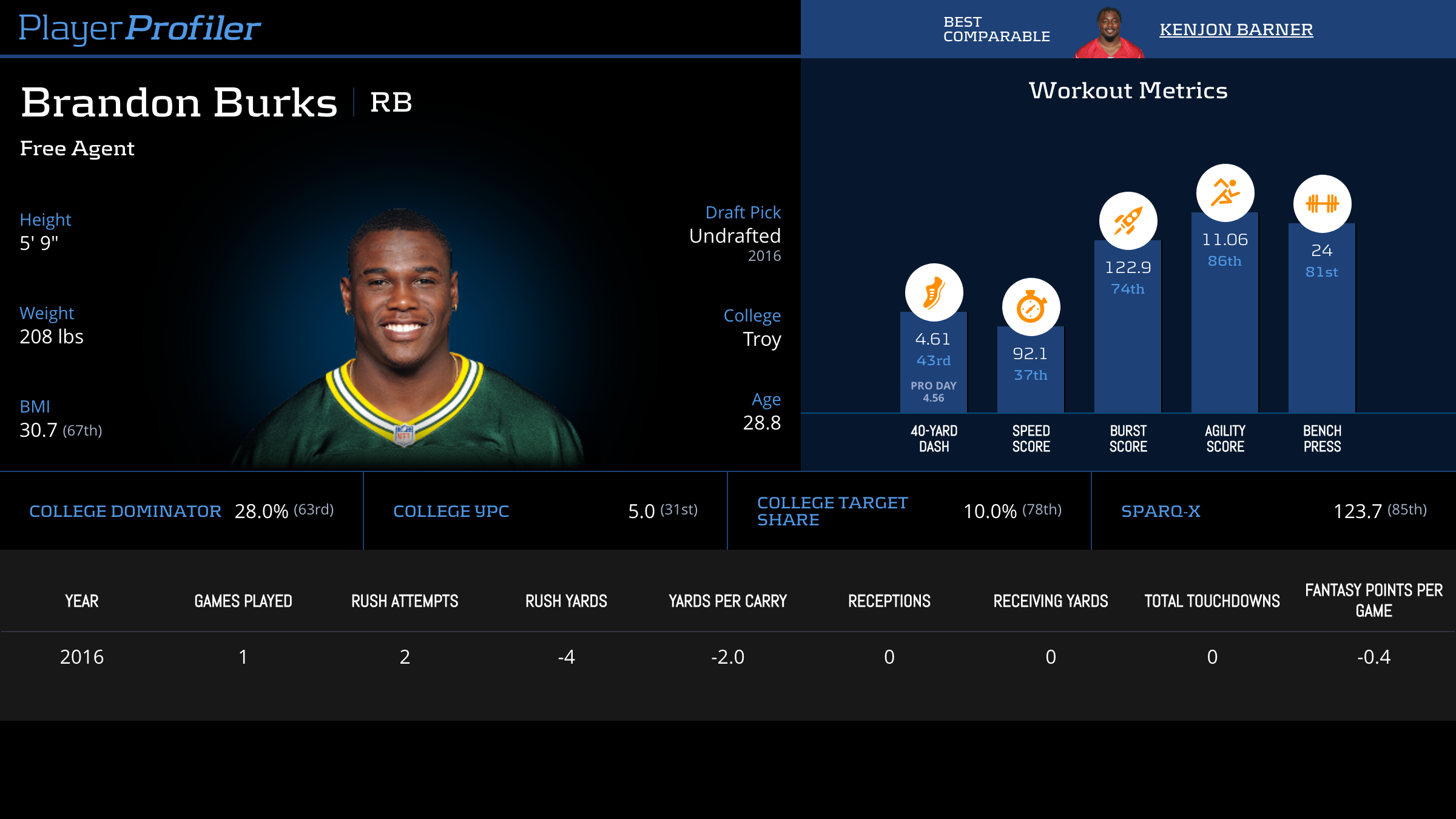| 17 | BUF | 6.7% | 2 | -- | 0 tgts | -- | -4 | -- | -0.4 (##92) |