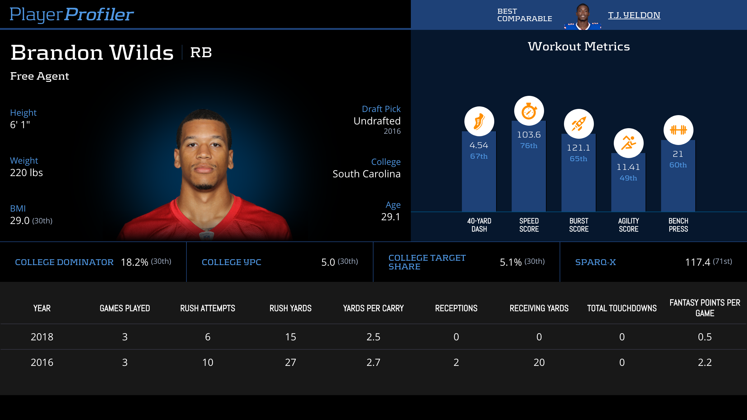 | Year Year | Games Games | Rush Attempts Rush Atts | Rushing Yards Rush Yrds | Total Touchdowns TDs | Receptions Rec | Receiving Yards Rec Yrds | Target Share Tgt Share | Age Age | School School |