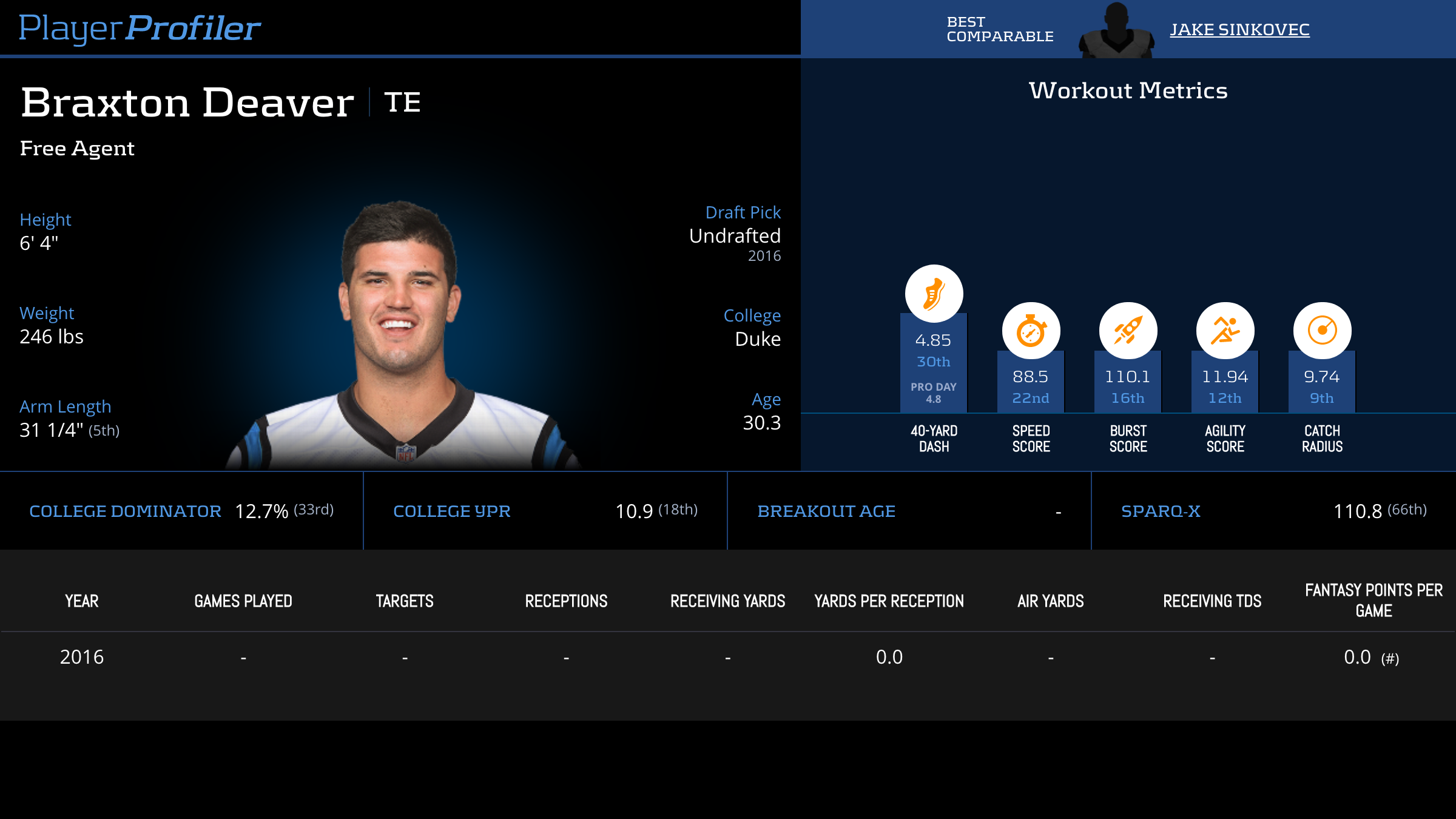| Year Year | Games Games | Receptions Recs | Receiving Yards Rec Yds | Target Share Tgt Share | Catch Rate Catch Rate | Receiving Touchdowns Rec TDs | Special Teams Yards Special Teams | Age Age | School School |