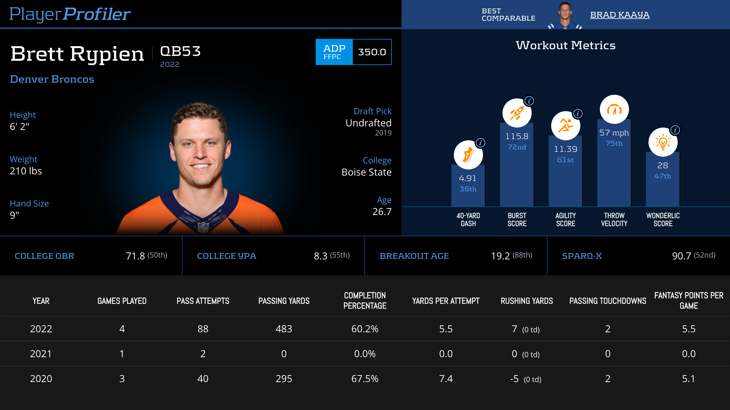 | Year Year | Games Games | Pass Attempts Pass Atts | Passing Yards Pass Yds | Yards Per Attempt YPA | Completion Percentage Comp % | Passing Touchdowns Pass TDs | Rushing Yards Rush Yds | Age Age | School School |