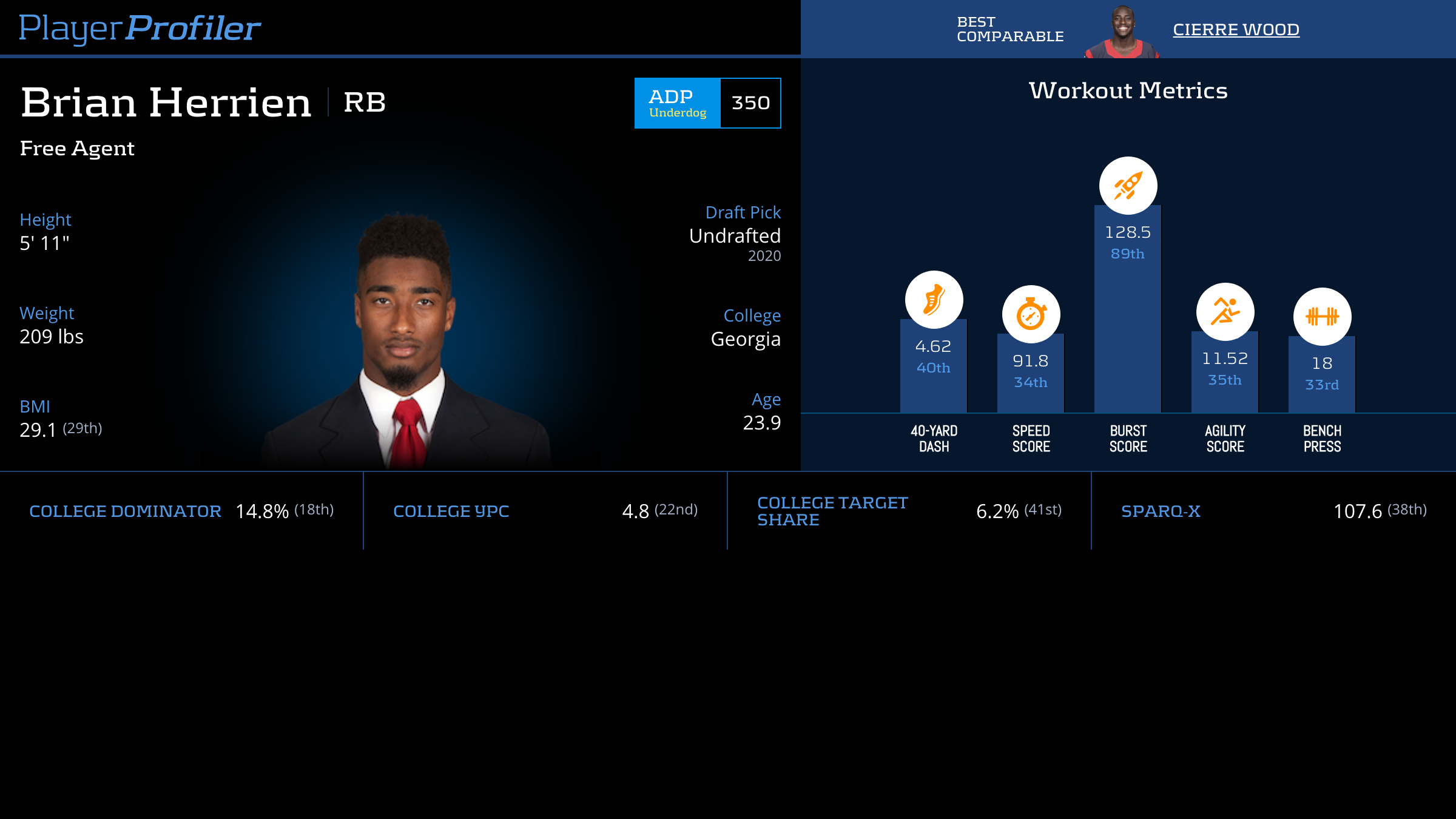 | Year Year | Games Games | Rush Attempts Rush Atts | Rushing Yards Rush Yrds | Total Touchdowns TDs | Receptions Rec | Receiving Yards Rec Yrds | Target Share Tgt Share | Age Age | School School |