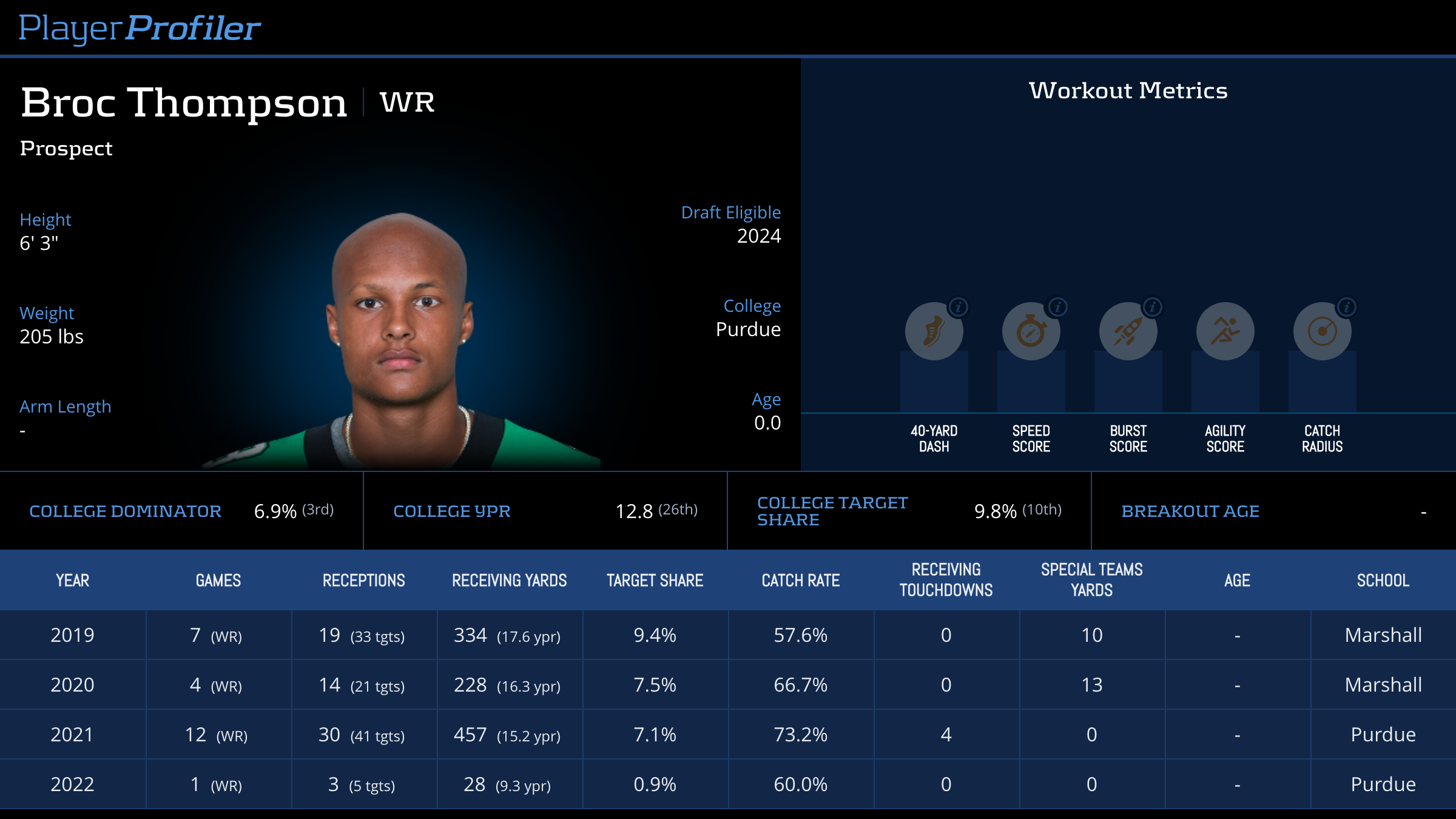 | Year Year | Games Games | Receptions Recs | Receiving Yards Rec Yds | Target Share Tgt Share | Catch Rate Catch Rate | Receiving Touchdowns Rec TDs | Special Teams Yards Special Teams | Age Age | School School |