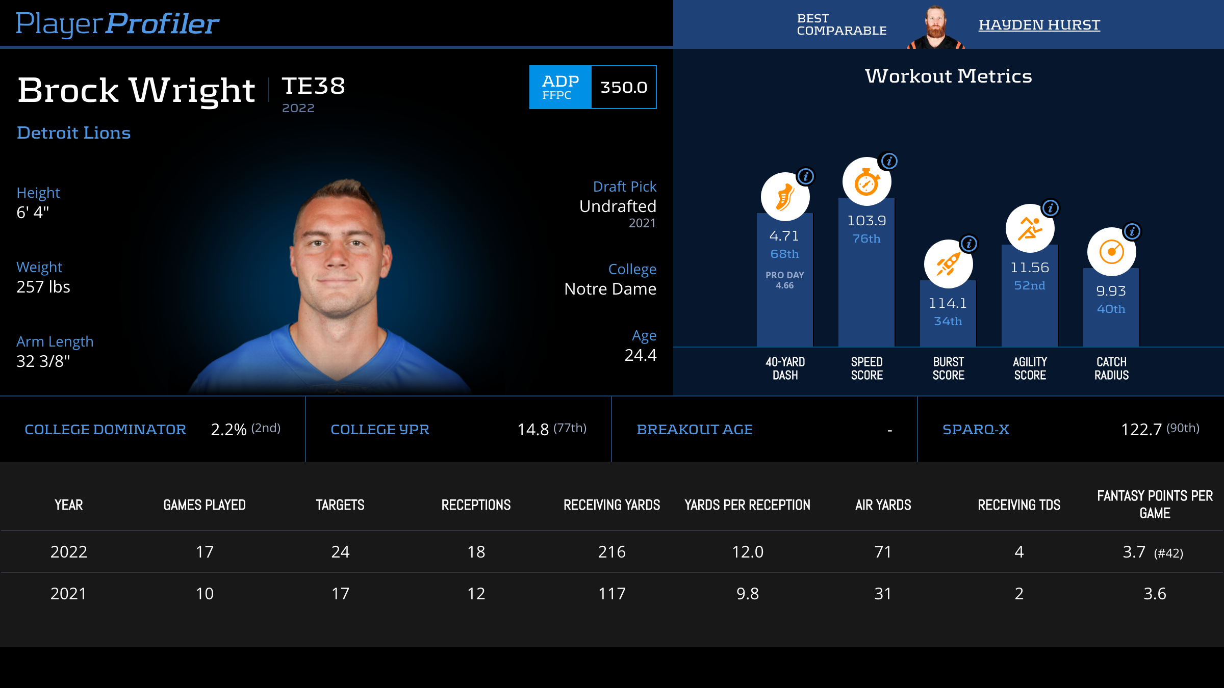 Box score statistics such as targets, yards, touchdowns, and fantasy points per target are updated the next day. Advanced stats and metrics are updated later in the week during the NFL season.