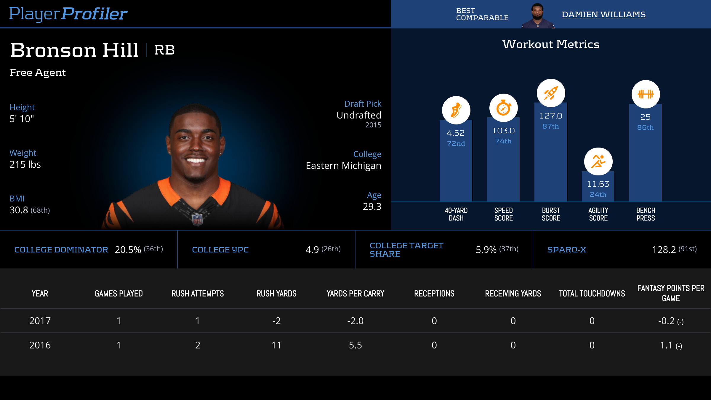 | Year Year | Games Games | Rush Attempts Rush Atts | Rushing Yards Rush Yrds | Total Touchdowns TDs | Receptions Rec | Receiving Yards Rec Yrds | Target Share Tgt Share | Age Age | School School |