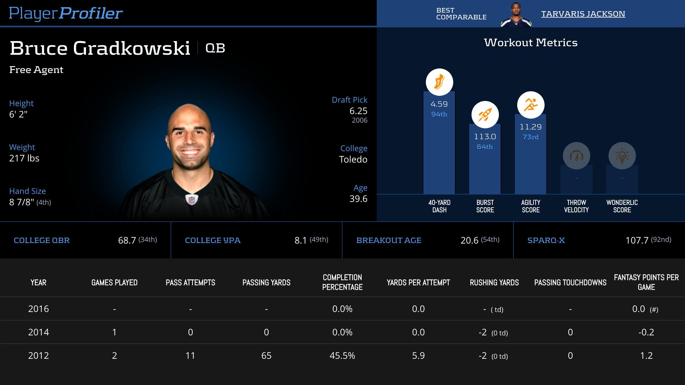 | Year Year | Games Games | Pass Attempts Pass Atts | Passing Yards Pass Yds | Yards Per Attempt YPA | Completion Percentage Comp % | Passing Touchdowns Pass TDs | Rushing Yards Rush Yds | Age Age | School School |