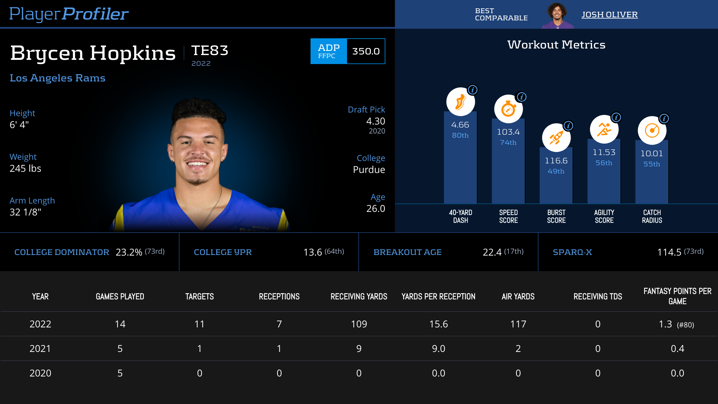 | Year Year | Games Games | Receptions Recs | Receiving Yards Rec Yds | Target Share Tgt Share | Catch Rate Catch Rate | Receiving Touchdowns Rec TDs | Special Teams Yards Special Teams | Age Age | School School |