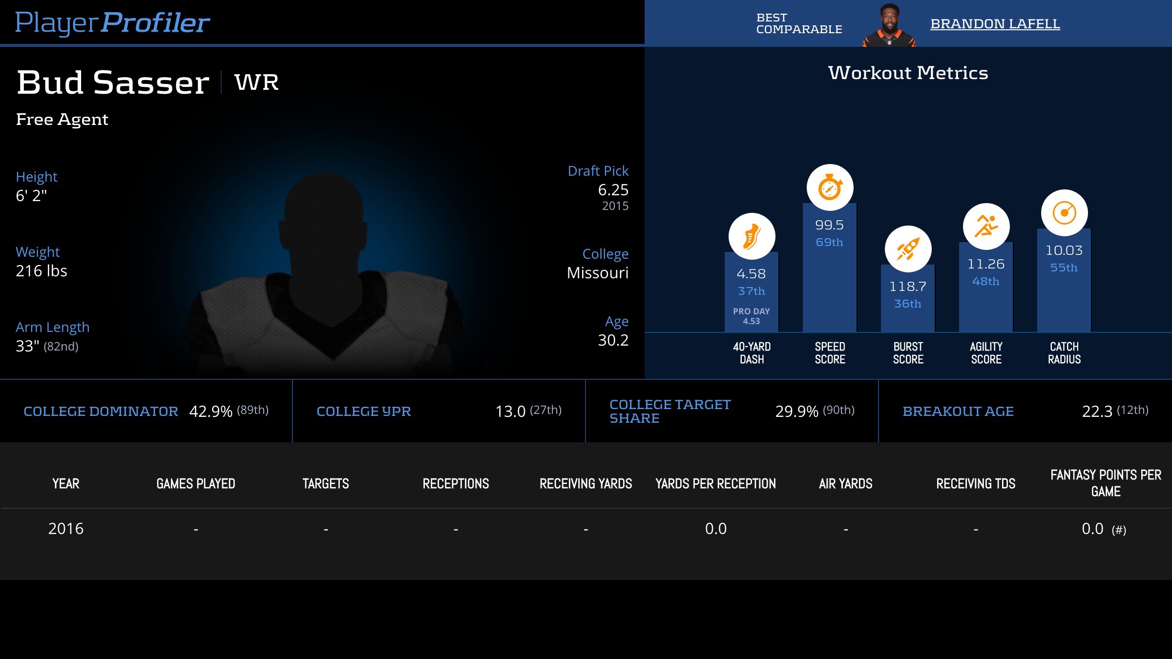 | Year Year | Games Games | Receptions Recs | Receiving Yards Rec Yds | Target Share Tgt Share | Catch Rate Catch Rate | Receiving Touchdowns Rec TDs | Special Teams Yards Special Teams | Age Age | School School |