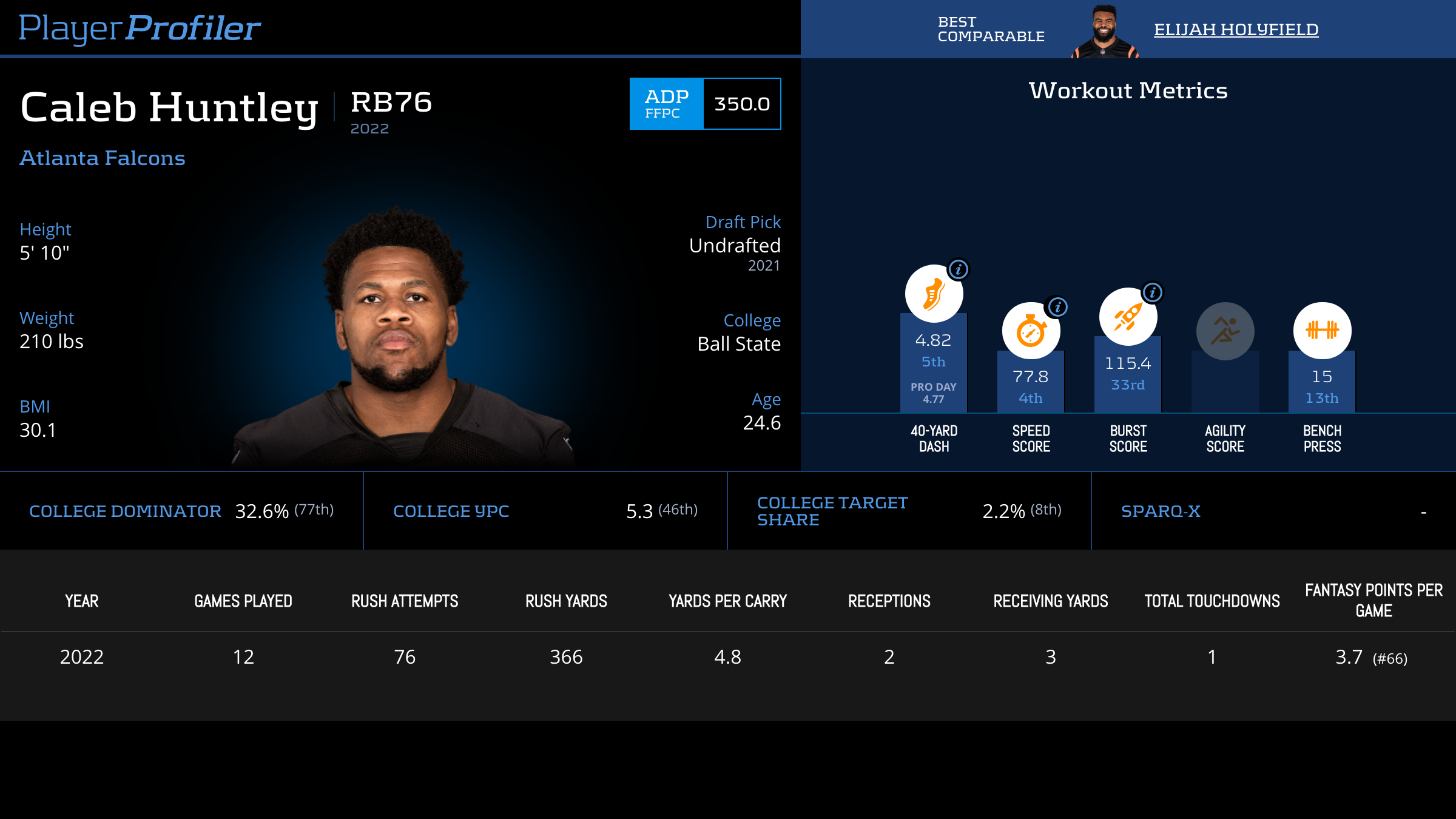 | Year Year | Games Games | Rush Attempts Rush Atts | Rushing Yards Rush Yrds | Total Touchdowns TDs | Receptions Rec | Receiving Yards Rec Yrds | Target Share Tgt Share | Age Age | School School |
