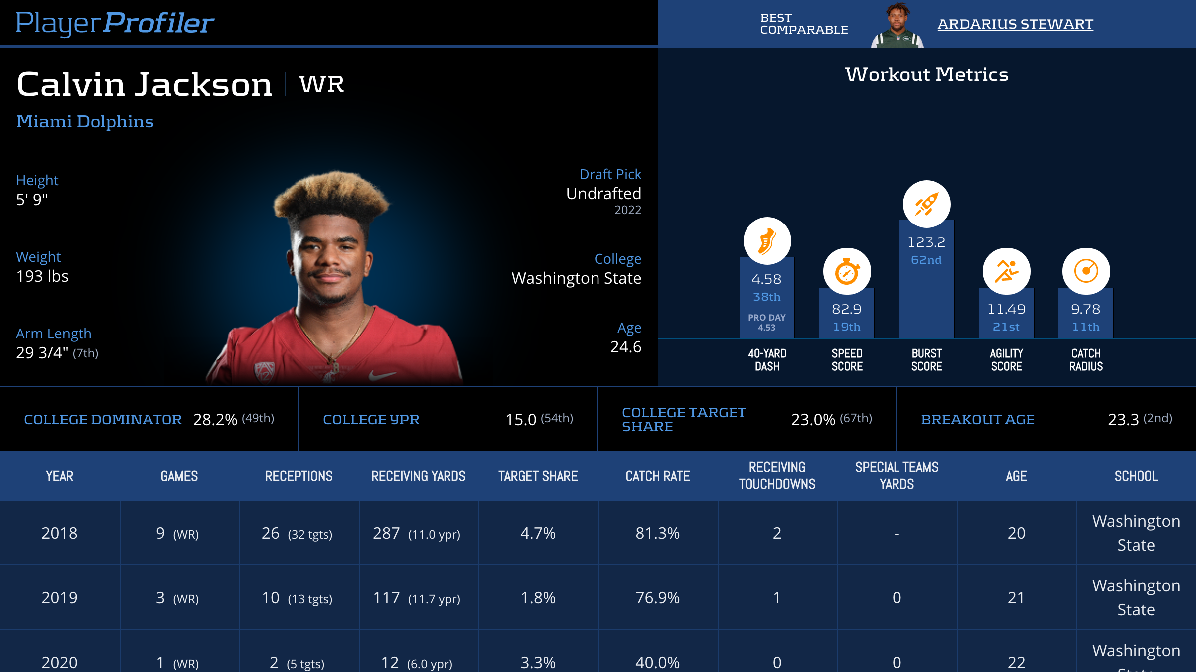 | Year Year | Games Games | Receptions Recs | Receiving Yards Rec Yds | Target Share Tgt Share | Catch Rate Catch Rate | Receiving Touchdowns Rec TDs | Special Teams Yards Special Teams | Age Age | School School |