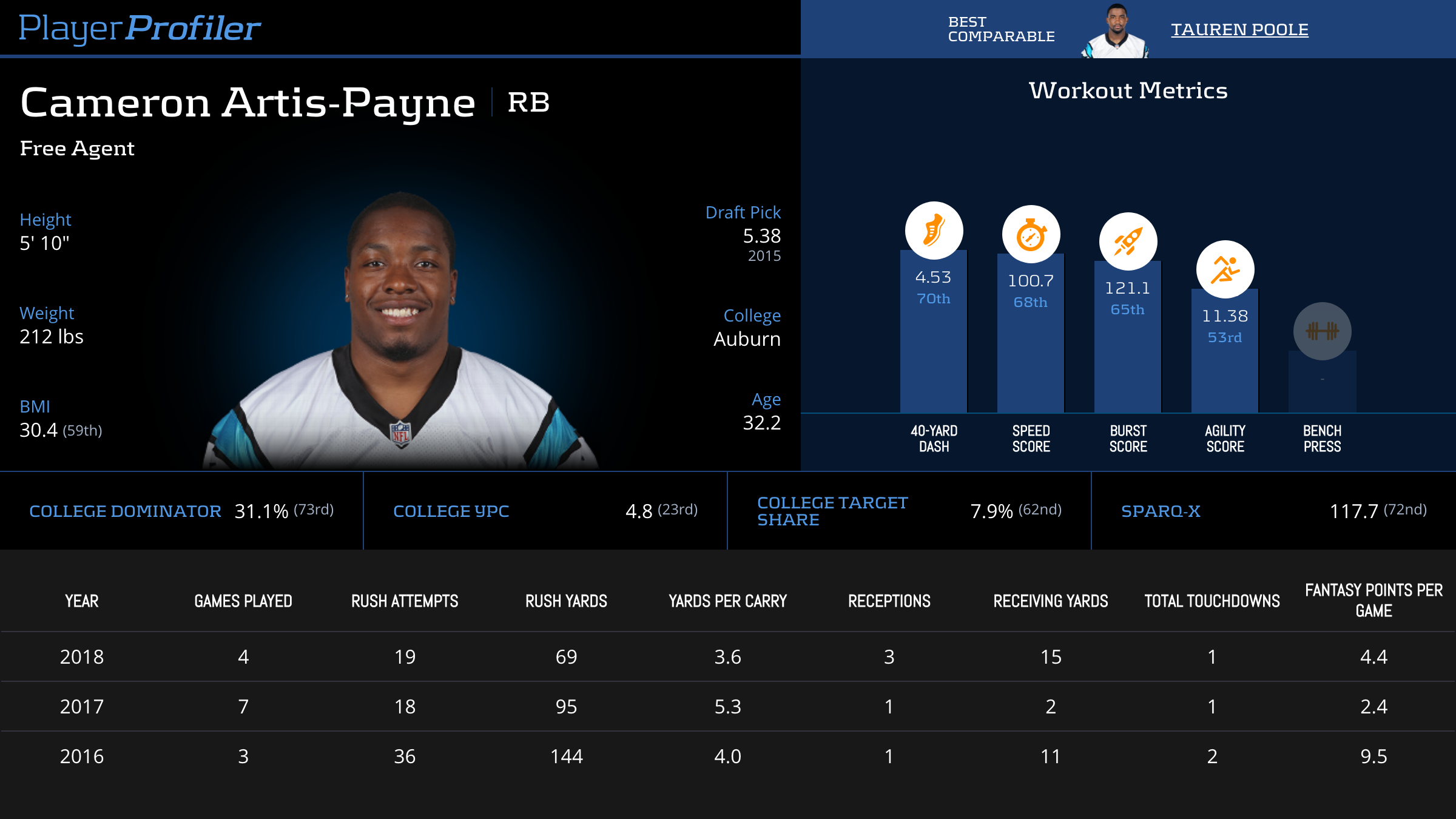 | Year Year | Games Games | Rush Attempts Rush Atts | Rushing Yards Rush Yrds | Total Touchdowns TDs | Receptions Rec | Receiving Yards Rec Yrds | Target Share Tgt Share | Age Age | School School |