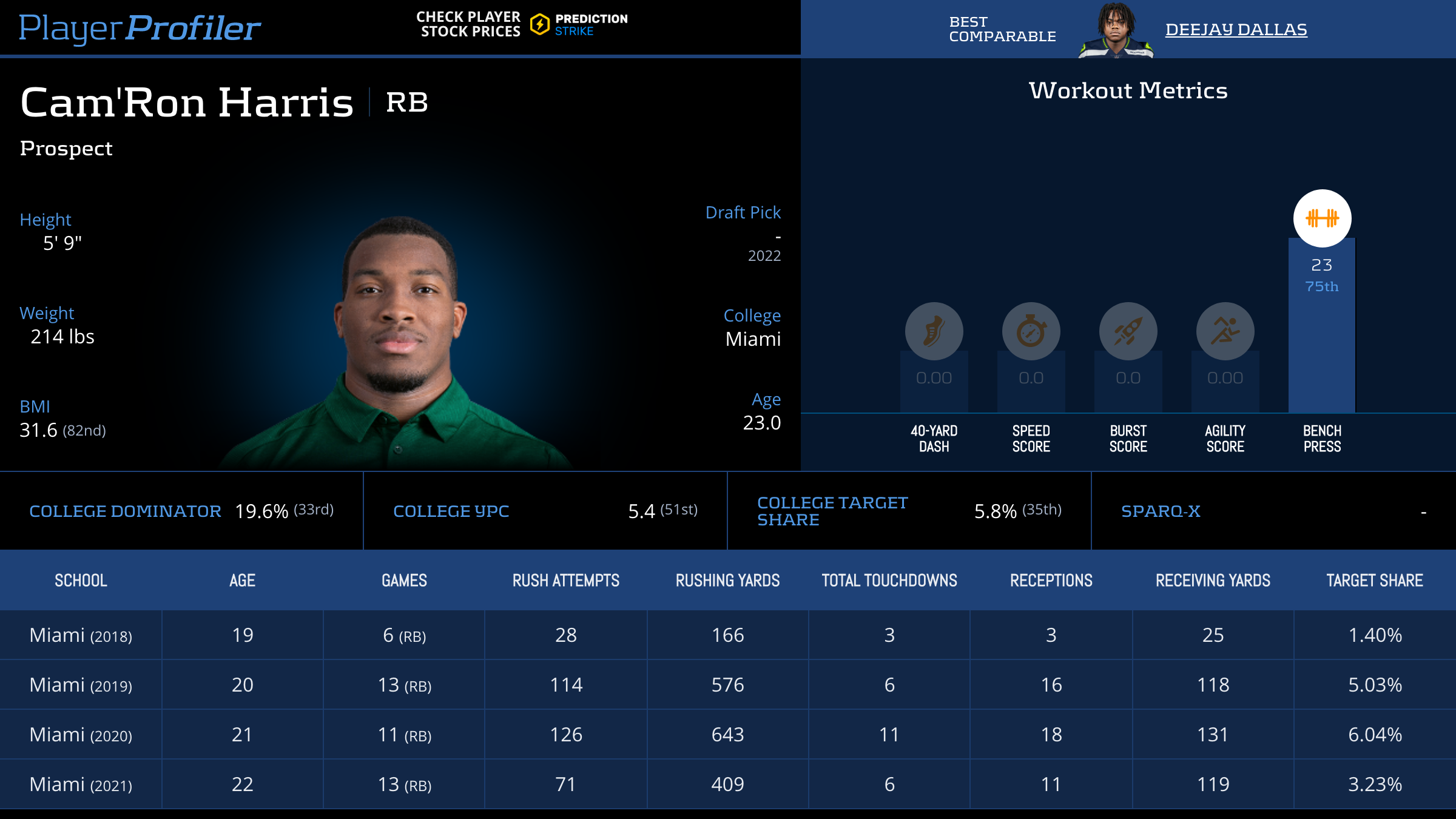 | Year Year | Games Games | Rush Attempts Rush Atts | Rushing Yards Rush Yrds | Total Touchdowns TDs | Receptions Rec | Receiving Yards Rec Yrds | Target Share Tgt Share | Age Age | School School |