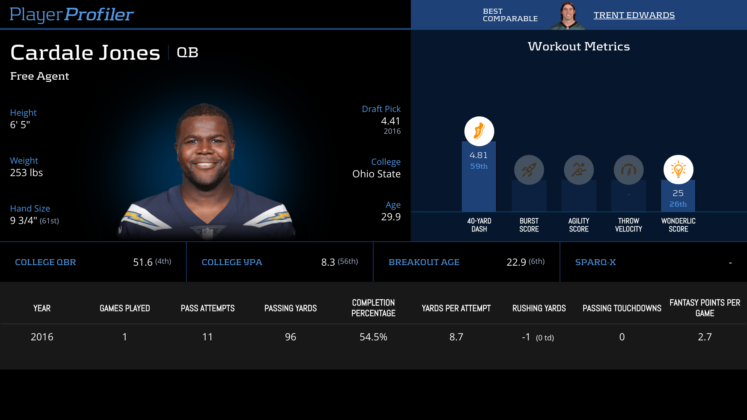 | 17 | NYJ | -- | 54.5% | 96 | 8.7 | 0 (1 int) | -1 | 0 tds | 2.7 (##33) |
