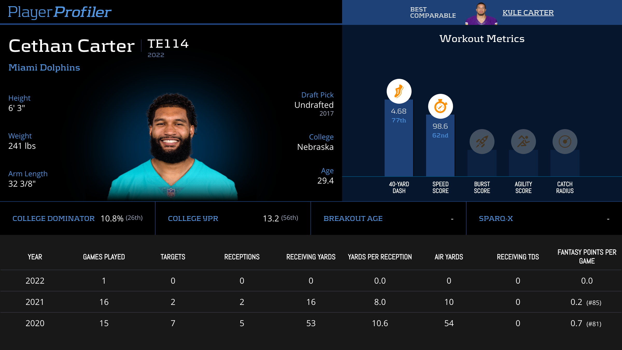| Year Year | Games Games | Receptions Recs | Receiving Yards Rec Yds | Target Share Tgt Share | Catch Rate Catch Rate | Receiving Touchdowns Rec TDs | Special Teams Yards Special Teams | Age Age | School School |