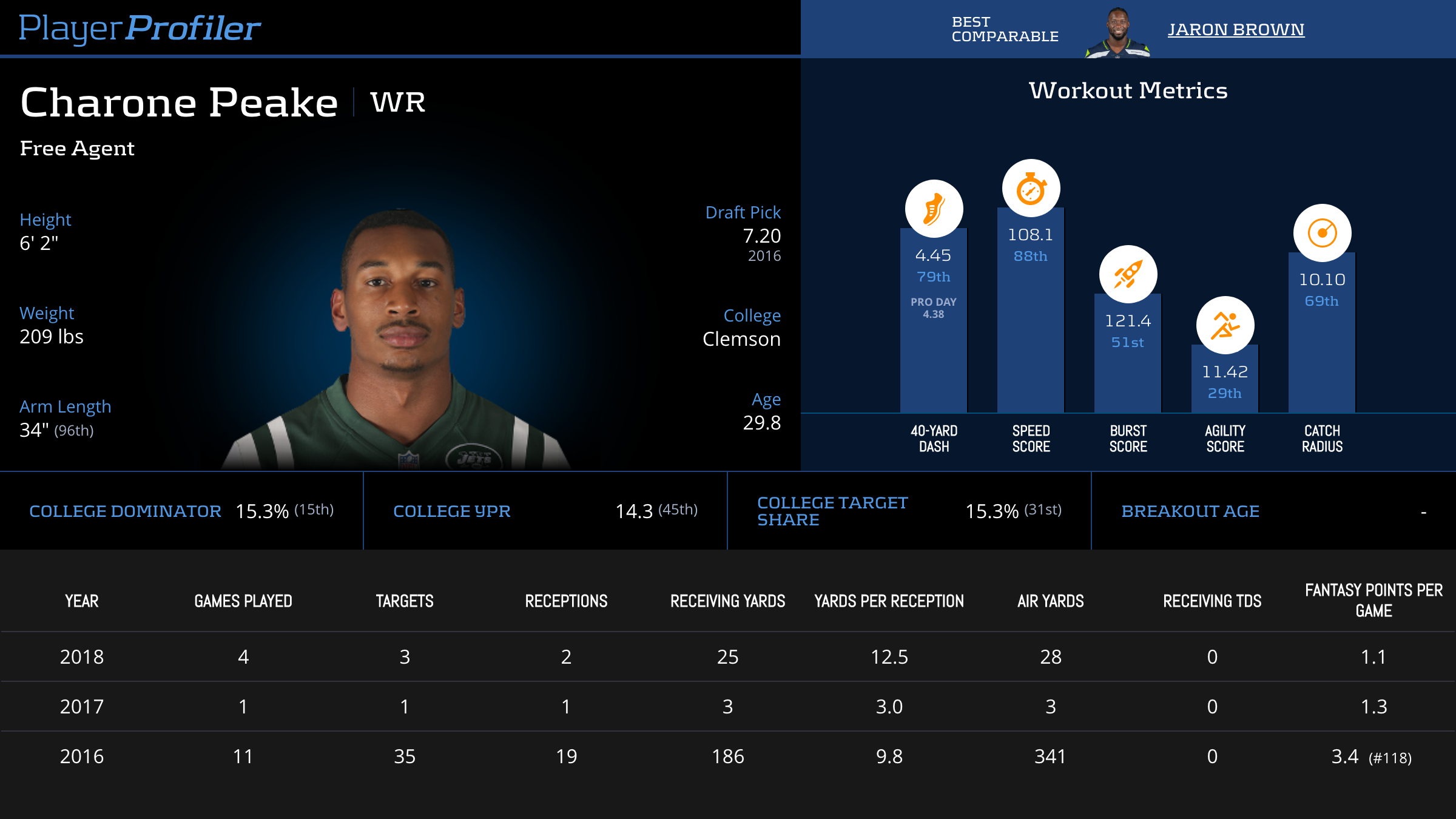 | Year Year | Games Games | Receptions Recs | Receiving Yards Rec Yds | Target Share Tgt Share | Catch Rate Catch Rate | Receiving Touchdowns Rec TDs | Special Teams Yards Special Teams | Age Age | School School |