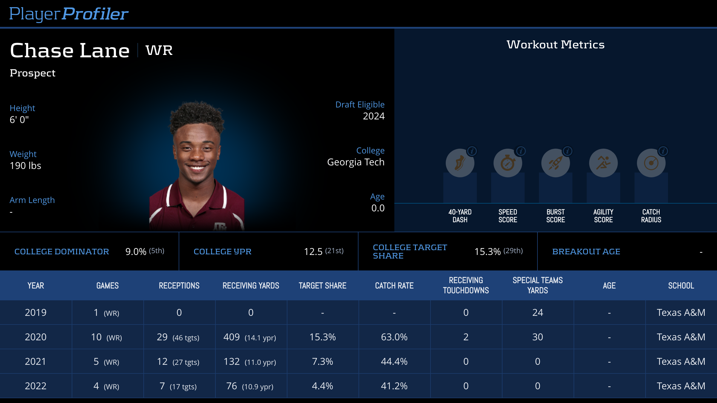 | Year Year | Games Games | Receptions Recs | Receiving Yards Rec Yds | Target Share Tgt Share | Catch Rate Catch Rate | Receiving Touchdowns Rec TDs | Special Teams Yards Special Teams | Age Age | School School |