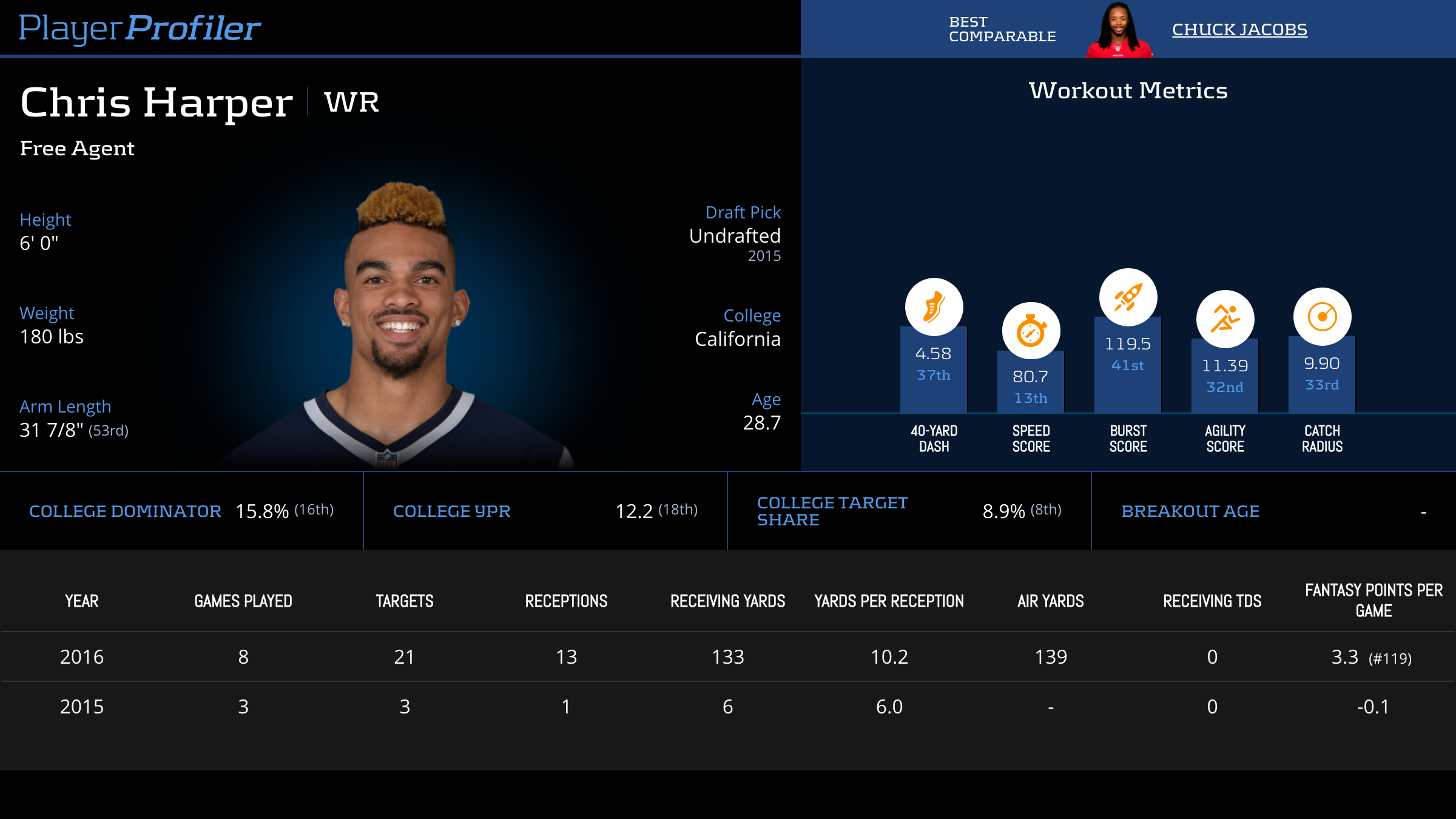 | Year Year | Games Games | Receptions Recs | Receiving Yards Rec Yds | Target Share Tgt Share | Catch Rate Catch Rate | Receiving Touchdowns Rec TDs | Special Teams Yards Special Teams | Age Age | School School |