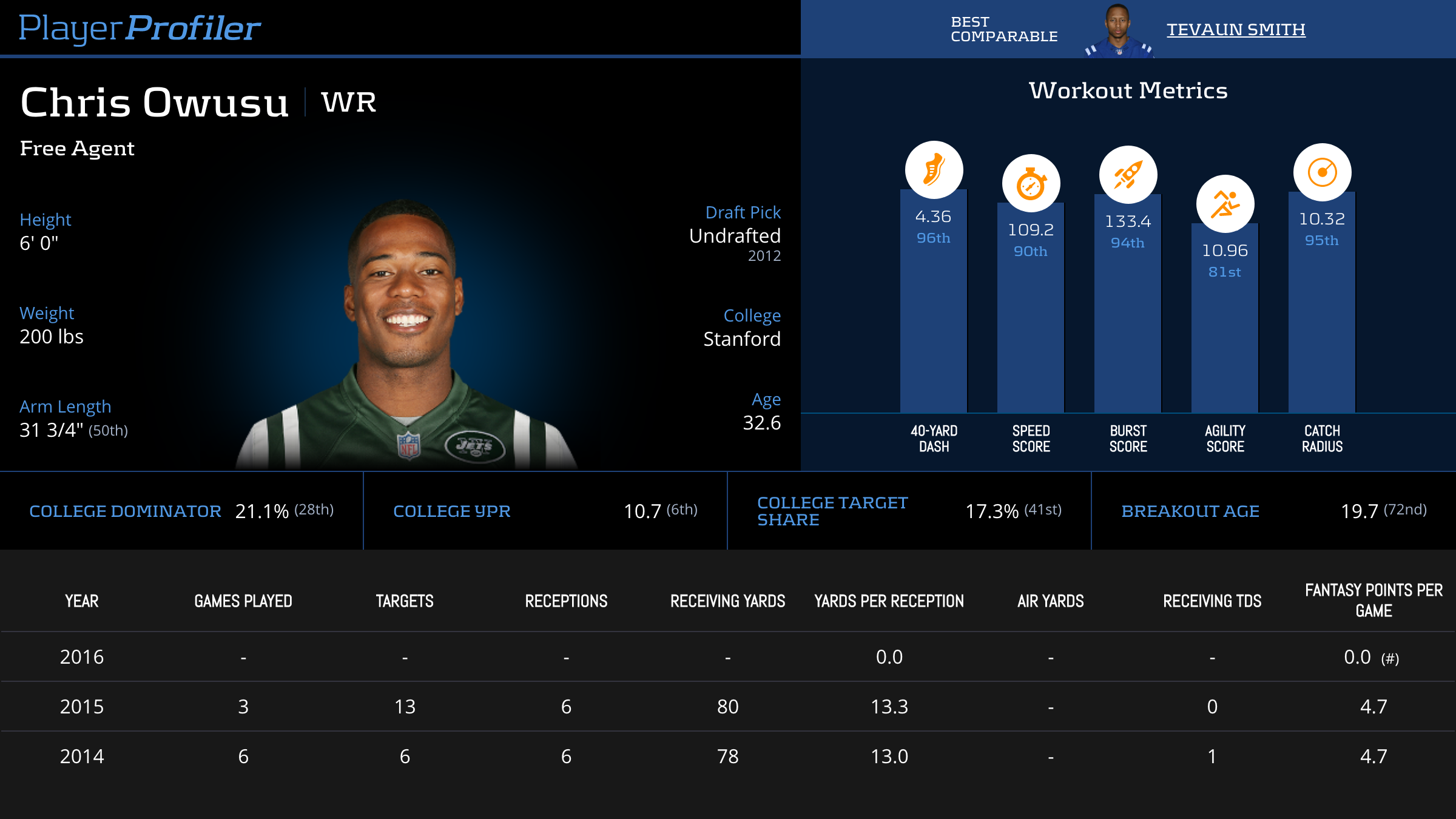 | Year Year | Games Games | Receptions Recs | Receiving Yards Rec Yds | Target Share Tgt Share | Catch Rate Catch Rate | Receiving Touchdowns Rec TDs | Special Teams Yards Special Teams | Age Age | School School |
