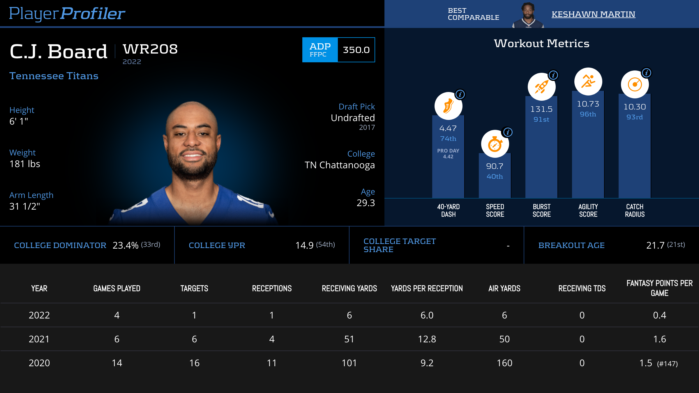 | Year Year | Games Games | Receptions Recs | Receiving Yards Rec Yds | Target Share Tgt Share | Catch Rate Catch Rate | Receiving Touchdowns Rec TDs | Special Teams Yards Special Teams | Age Age | School School |