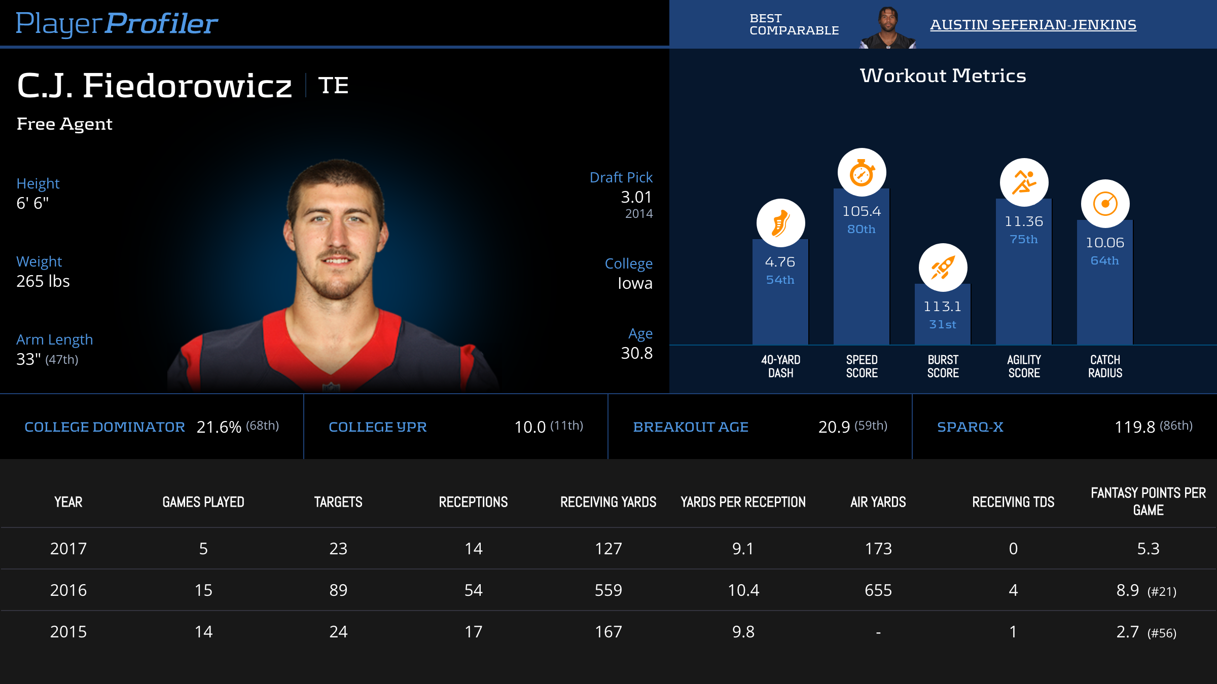 | Year Year | Games Games | Receptions Recs | Receiving Yards Rec Yds | Target Share Tgt Share | Catch Rate Catch Rate | Receiving Touchdowns Rec TDs | Special Teams Yards Special Teams | Age Age | School School |