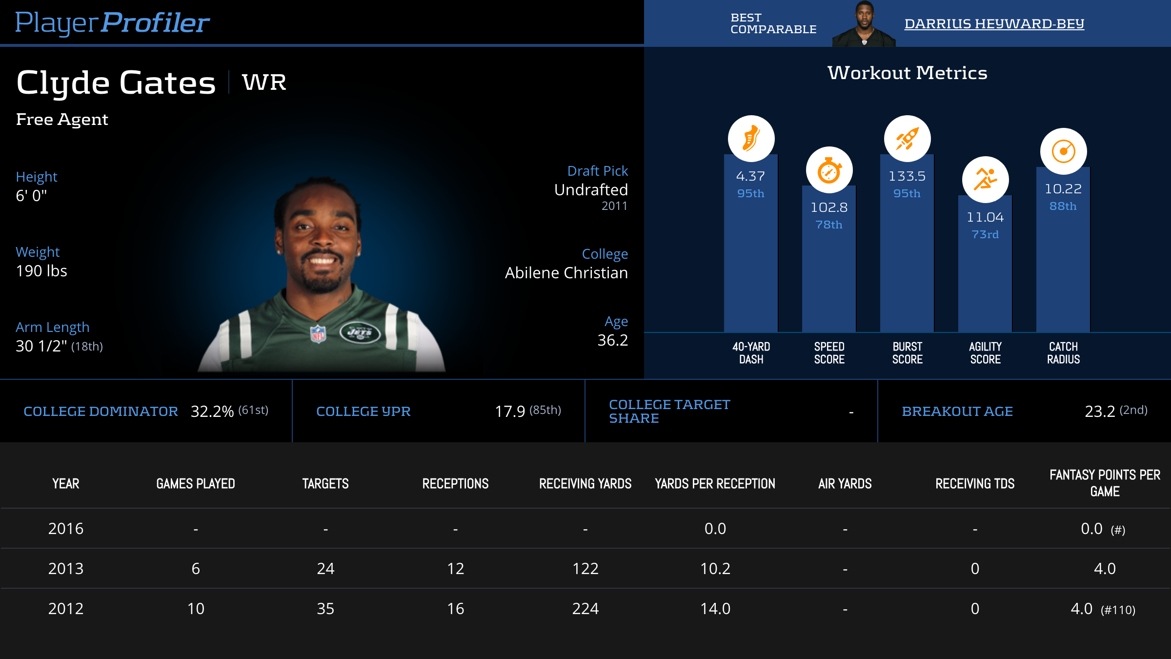 Year Games Tgts Rec Rec Yds YPR Air Yds Rec TD Fantasy Pts/Game
