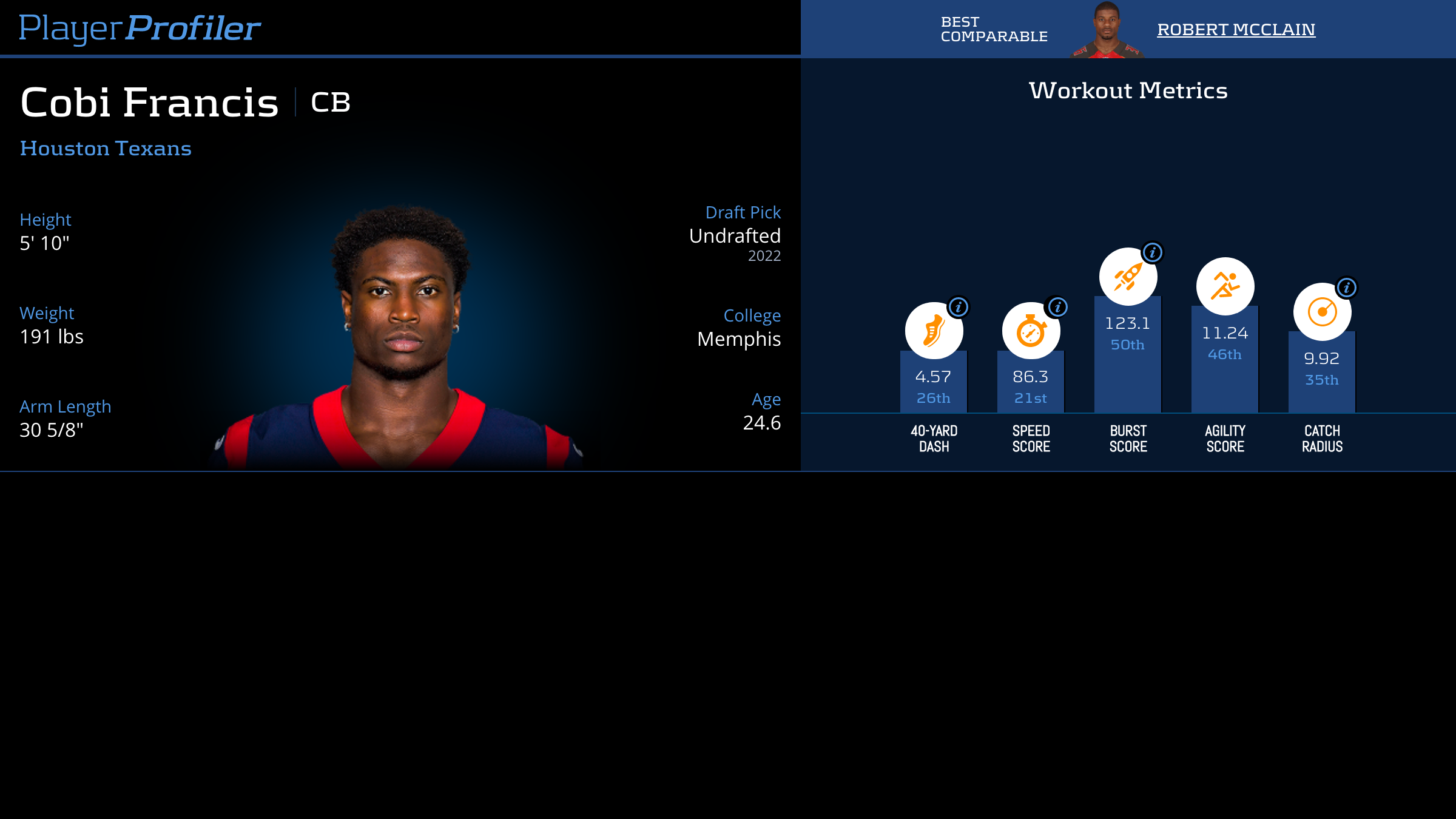 Download all Cobi Francis advanced stats and metrics with Data Analysis.