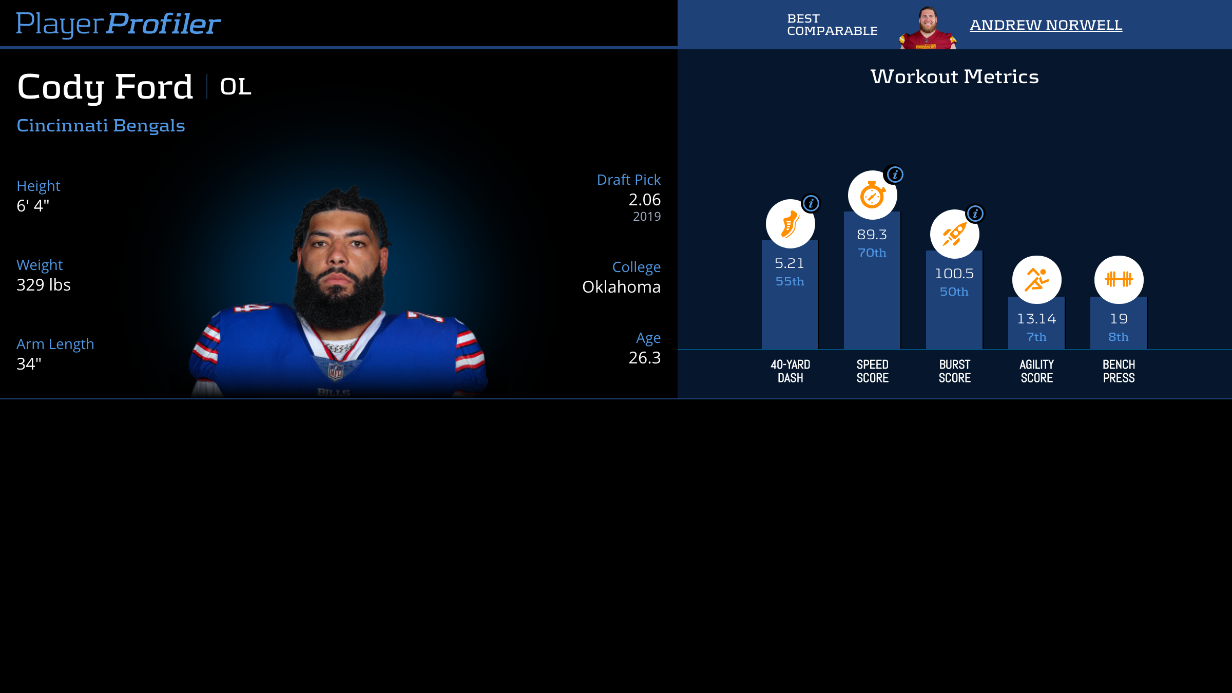 Download all Cody Ford advanced stats and metrics with Data Analysis.