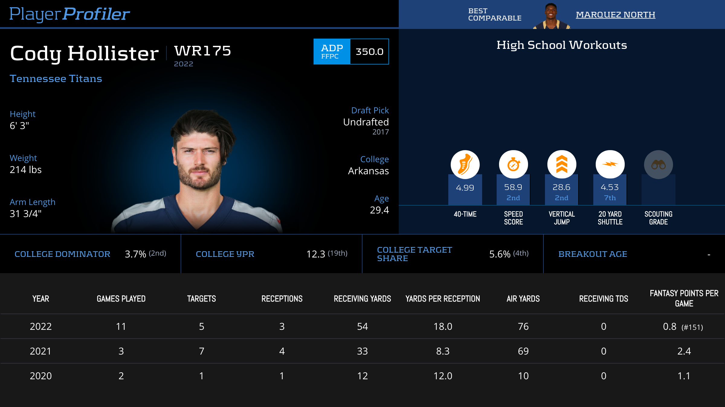| Year Year | Games Games | Receptions Recs | Receiving Yards Rec Yds | Target Share Tgt Share | Catch Rate Catch Rate | Receiving Touchdowns Rec TDs | Special Teams Yards Special Teams | Age Age | School School |