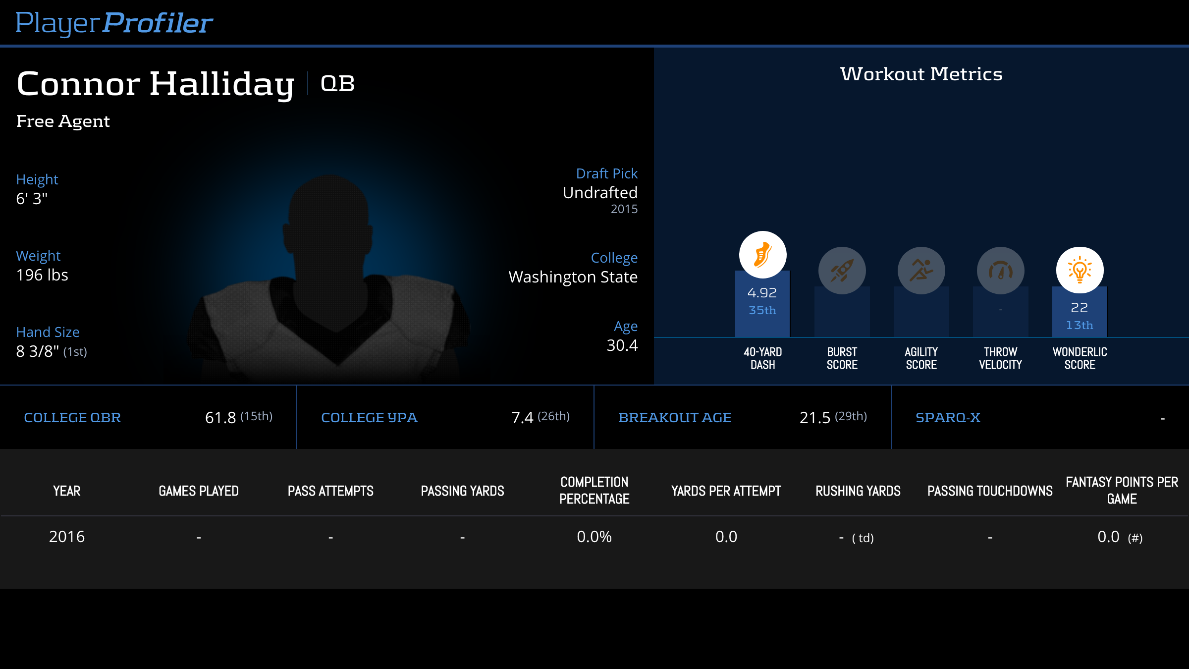 | Year Year | Games Games | Pass Attempts Pass Atts | Passing Yards Pass Yds | Yards Per Attempt YPA | Completion Percentage Comp % | Passing Touchdowns Pass TDs | Rushing Yards Rush Yds | Age Age | School School |