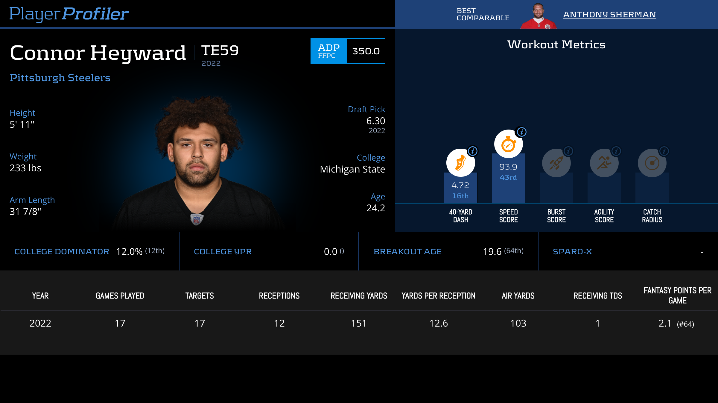 | Year Year | Games Games | Receptions Recs | Receiving Yards Rec Yds | Target Share Tgt Share | Catch Rate Catch Rate | Receiving Touchdowns Rec TDs | Special Teams Yards Special Teams | Age Age | School School |