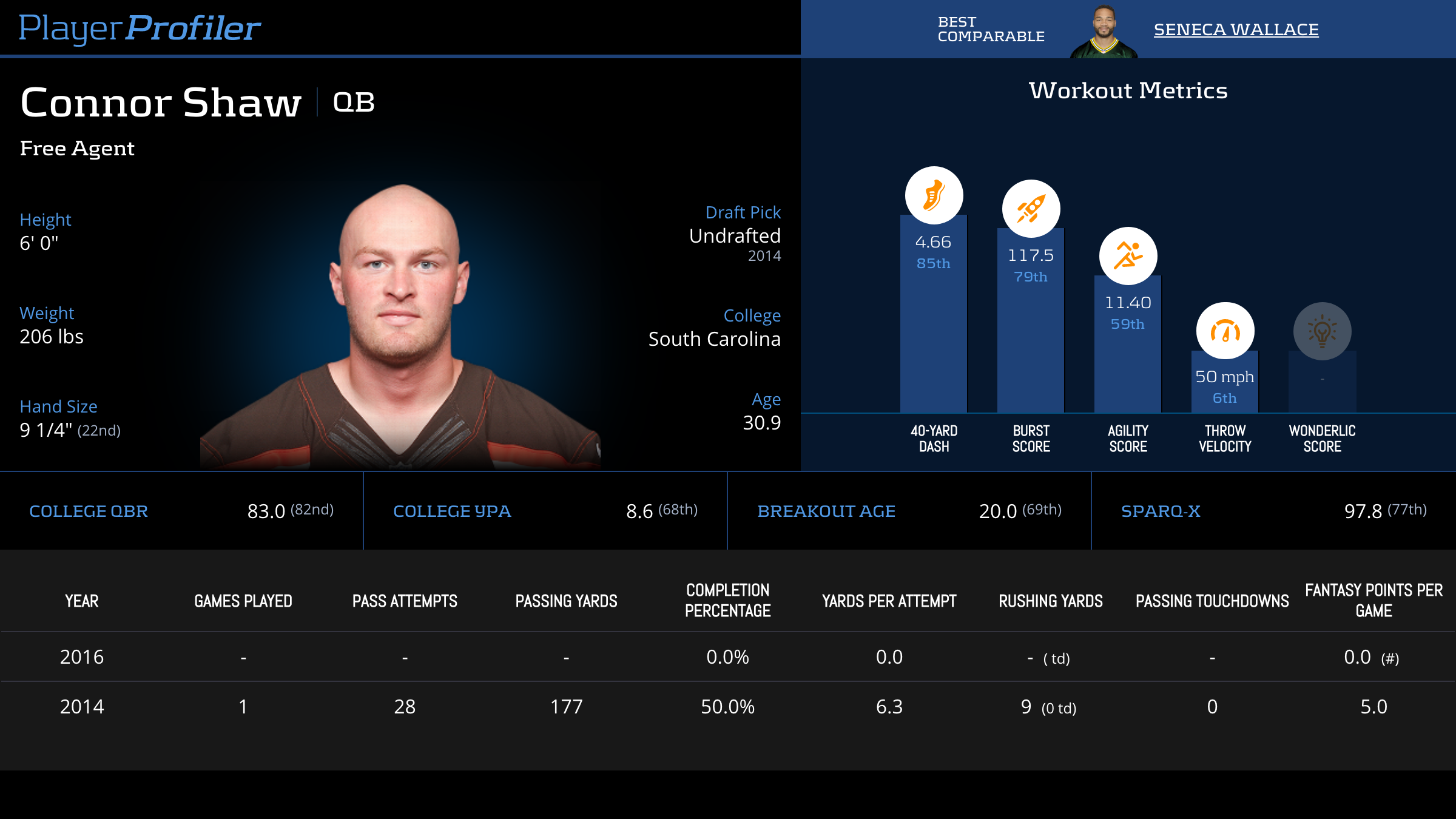 | 17 | BAL | -- | 50.0% | 177 | 6.3 | 0 (1 int) | 7 | 0 tds | 3.8 |