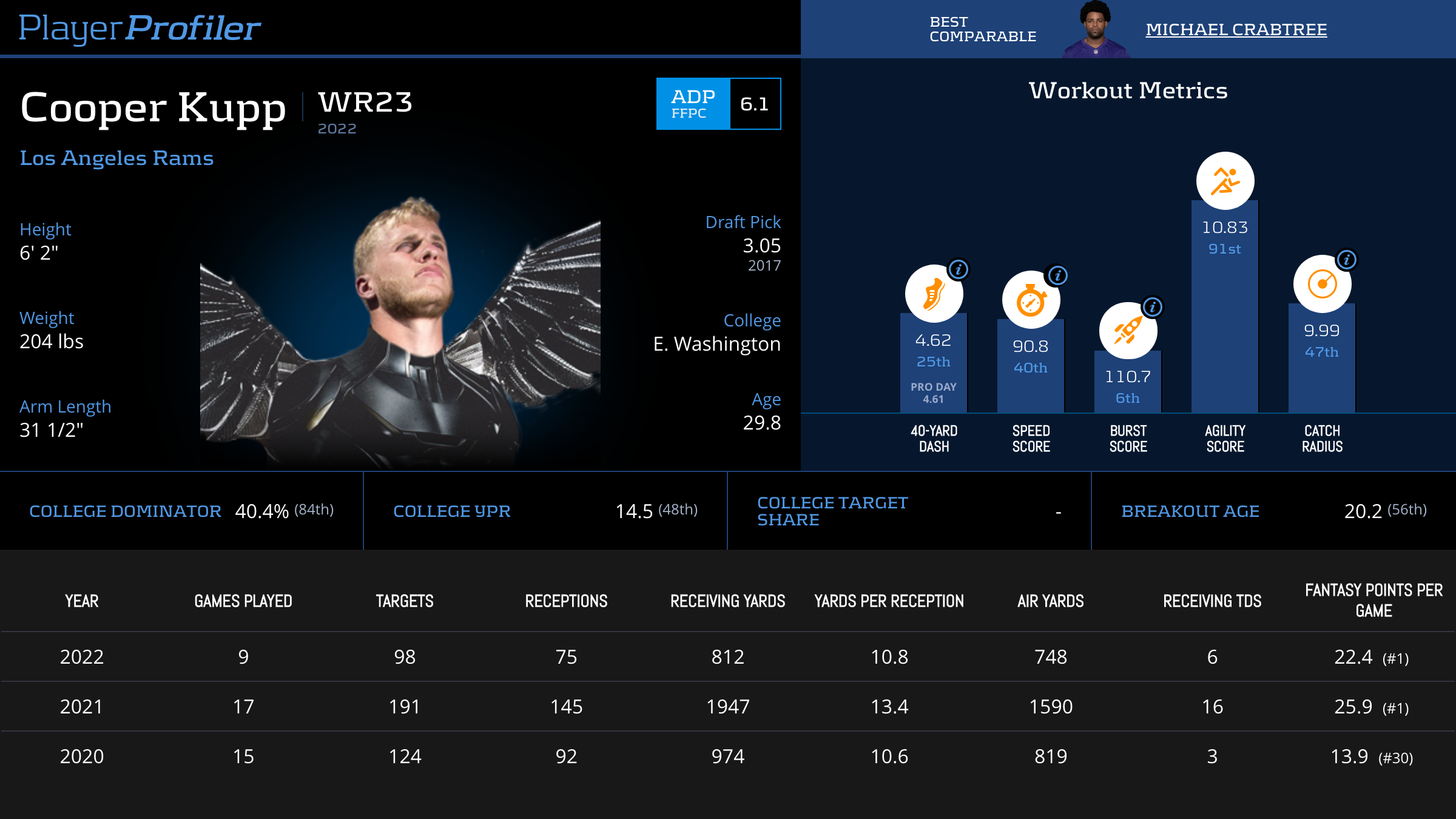 Box score statistics such as targets, yards, touchdowns, and fantasy points per target are updated the next day. Advanced stats and metrics are updated later in the week during the NFL season.