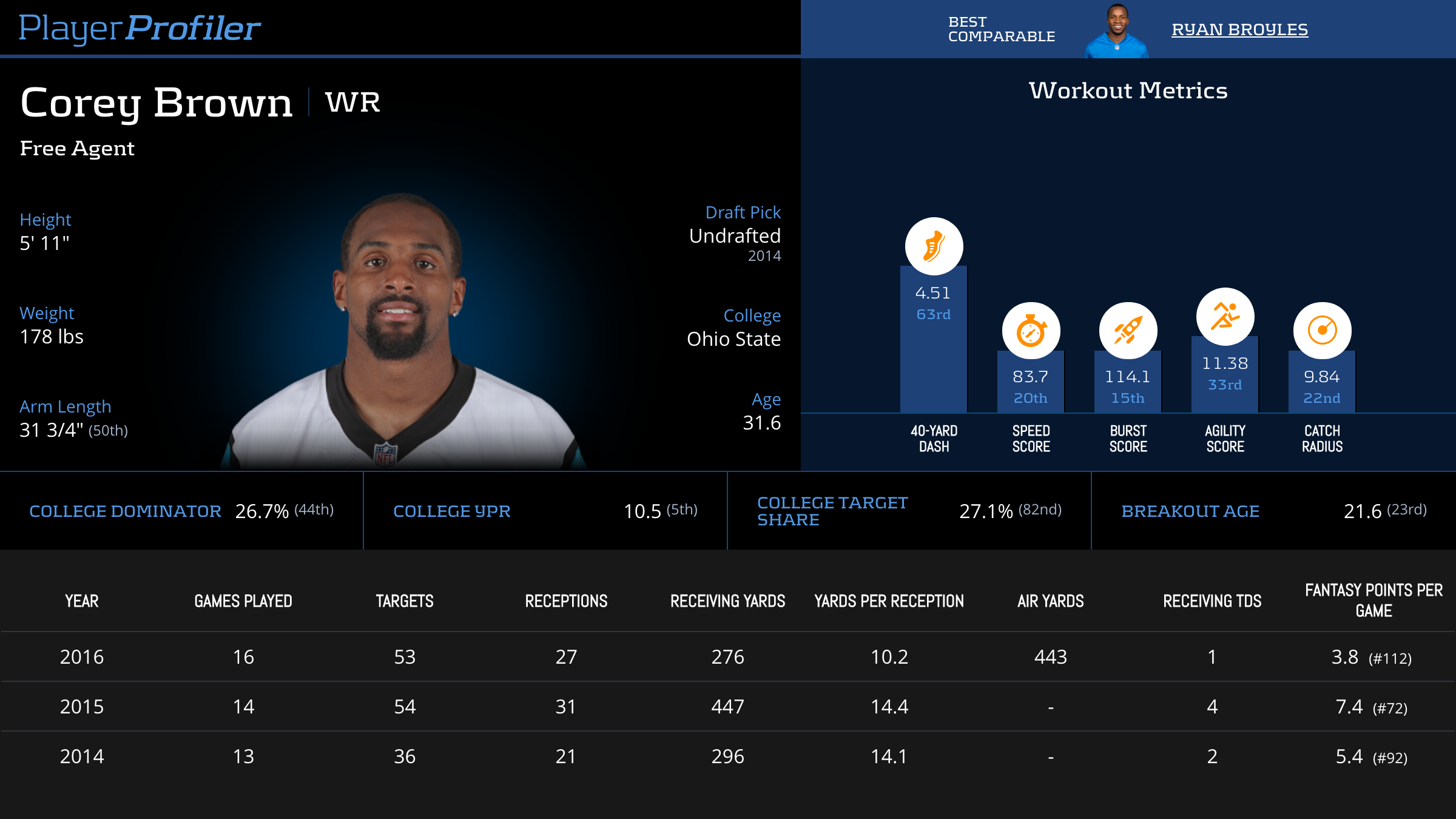 | Year Year | Games Games | Receptions Recs | Receiving Yards Rec Yds | Target Share Tgt Share | Catch Rate Catch Rate | Receiving Touchdowns Rec TDs | Special Teams Yards Special Teams | Age Age | School School |