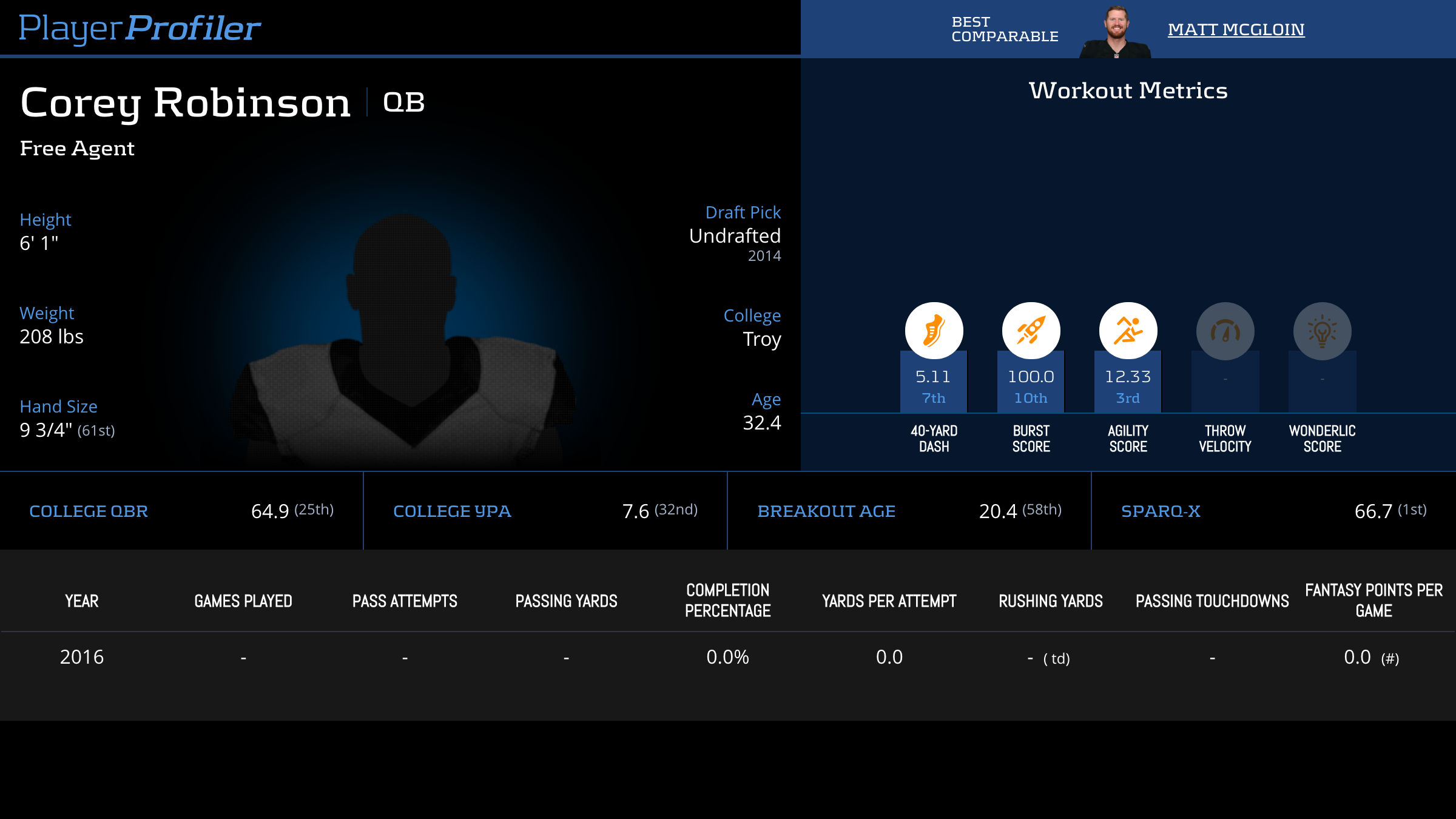 | Year Year | Games Games | Pass Attempts Pass Atts | Passing Yards Pass Yds | Yards Per Attempt YPA | Completion Percentage Comp % | Passing Touchdowns Pass TDs | Rushing Yards Rush Yds | Age Age | School School |