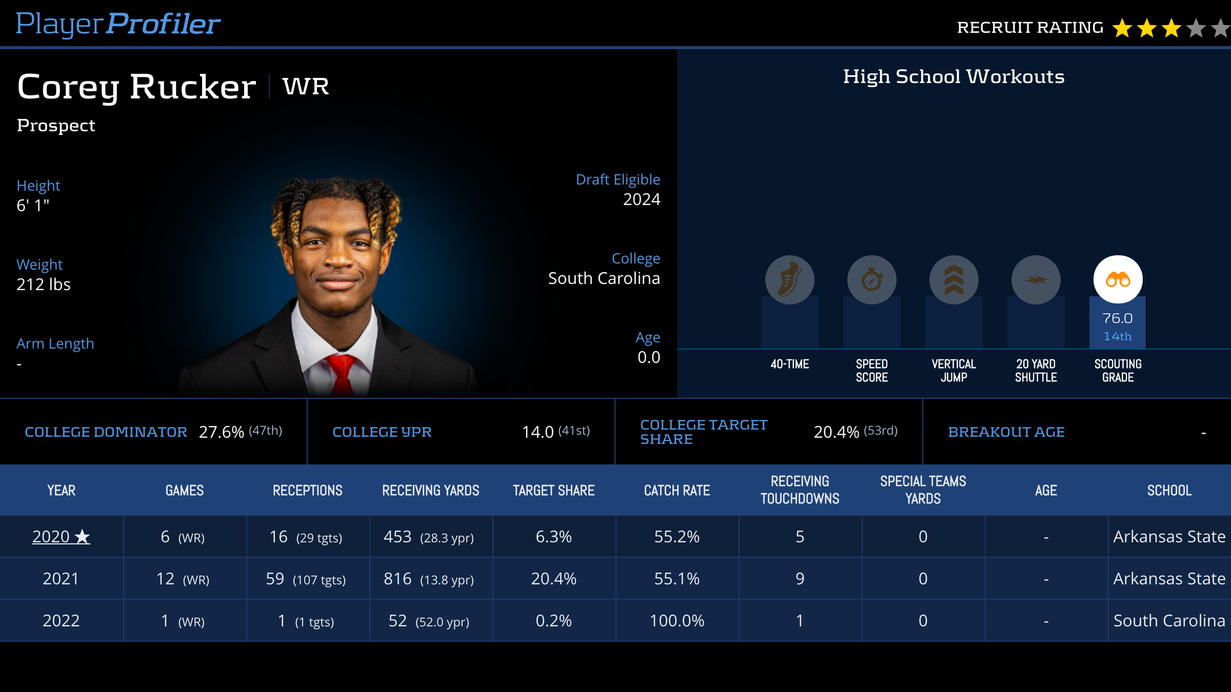 | Year Year | Games Games | Receptions Recs | Receiving Yards Rec Yds | Target Share Tgt Share | Catch Rate Catch Rate | Receiving Touchdowns Rec TDs | Special Teams Yards Special Teams | Age Age | School School |