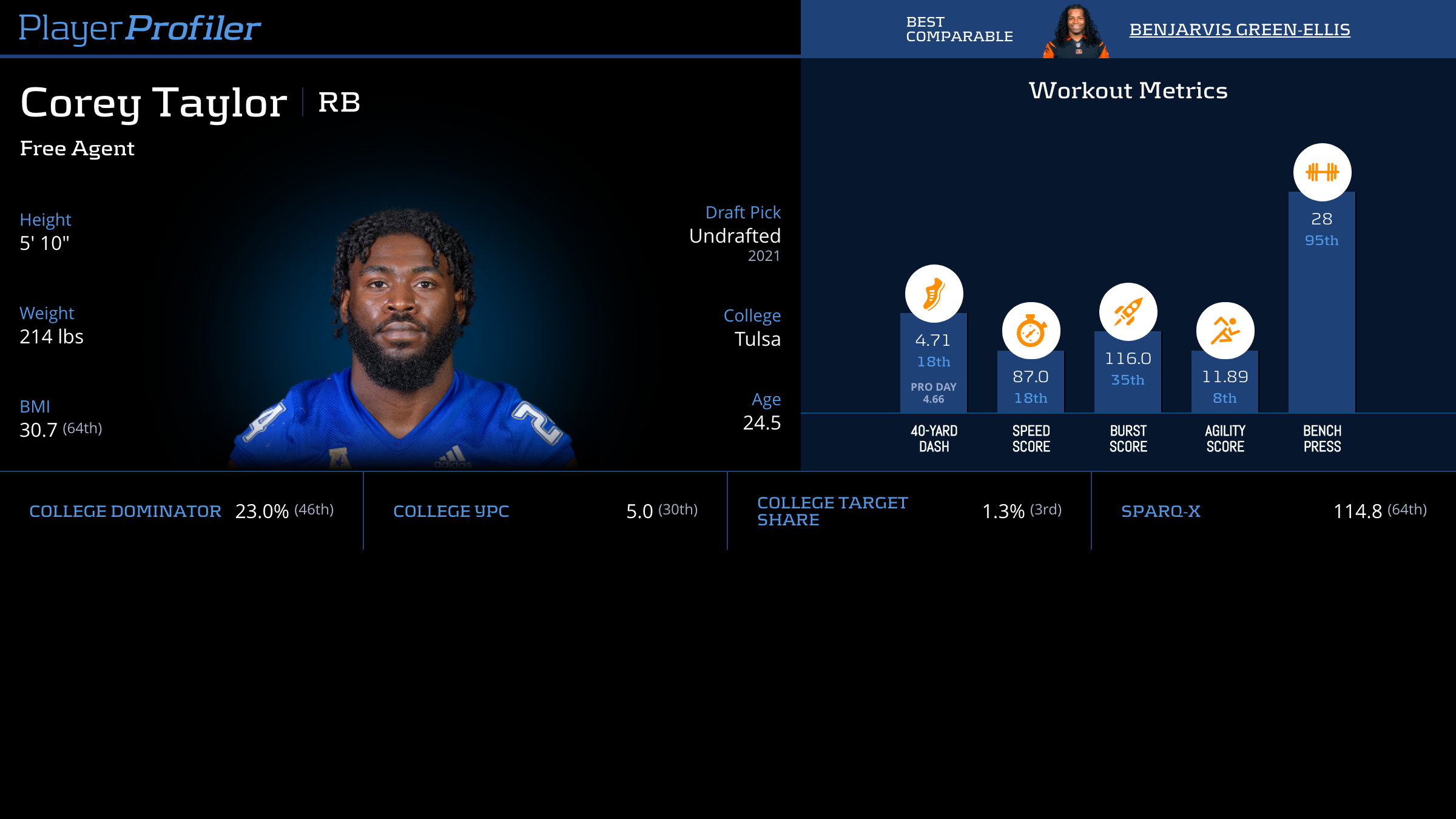 | Year Year | Games Games | Rush Attempts Rush Atts | Rushing Yards Rush Yrds | Total Touchdowns TDs | Receptions Rec | Receiving Yards Rec Yrds | Target Share Tgt Share | Age Age | School School |